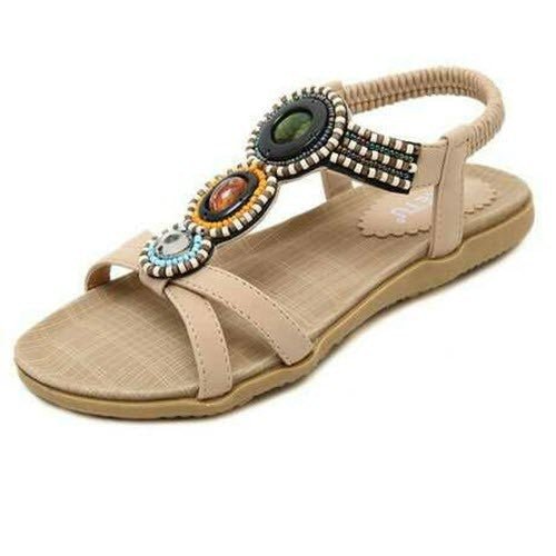Beaded Flower Bohemian Tribal Gladiator Slingback Flat Sandal Apricot