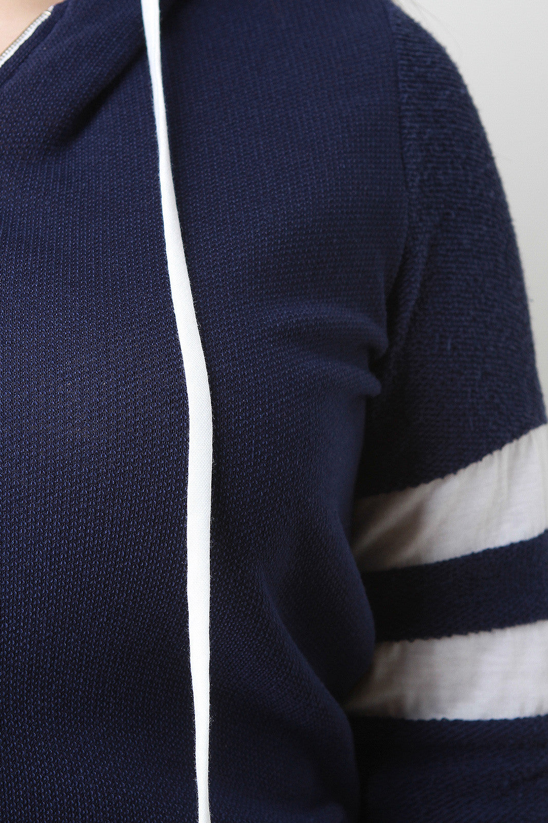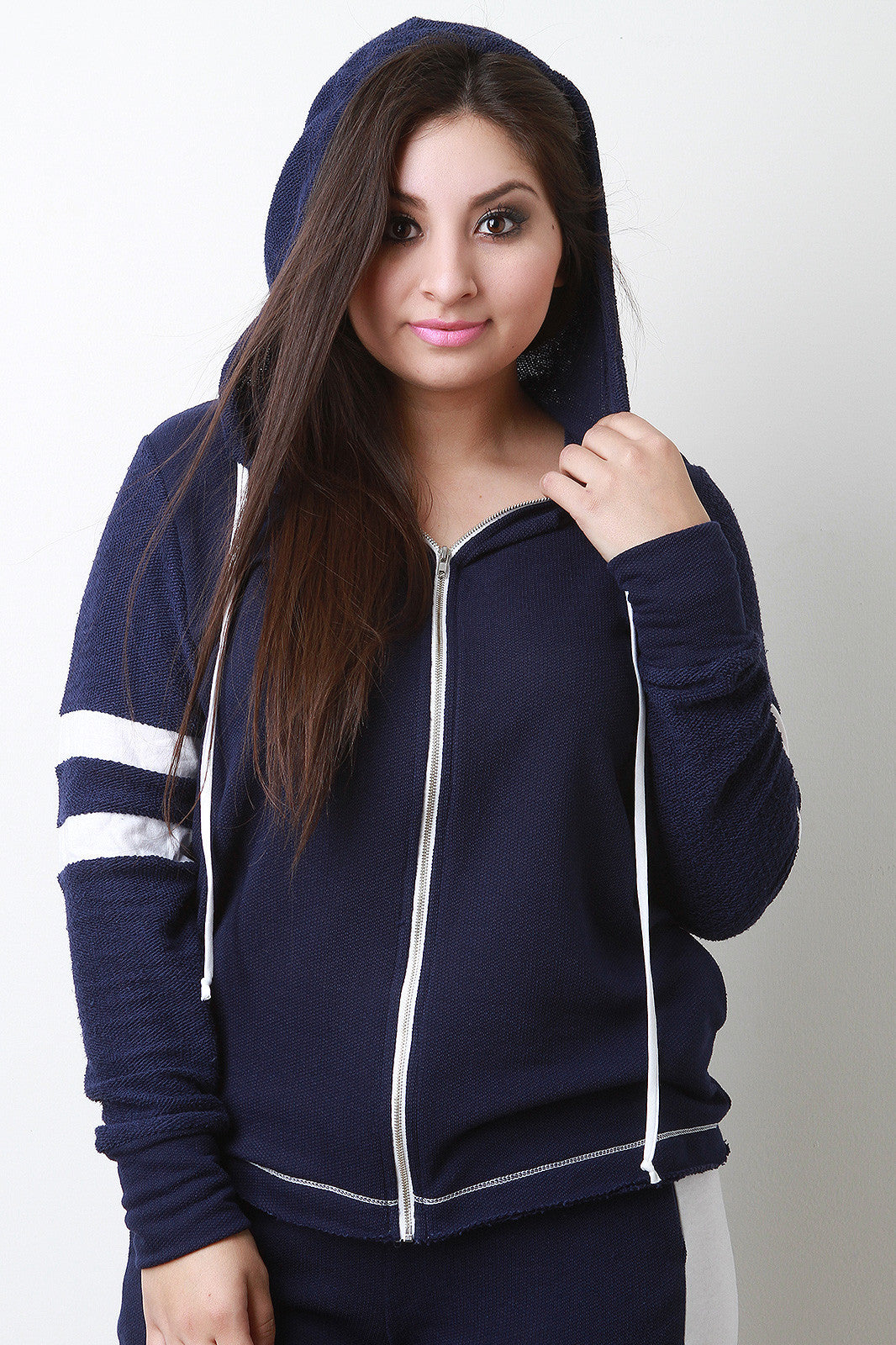 This sporty plus size hoodie features an attached hooded collar with drawstrings, full zip-up front, long sleeves with accent stripes, and banded cuffs. Finished with raw straight hemline. Accessories sold separately. Made in U.S.A. Self: 60% Cotton, 40% Polyester. Contrast: 87% Polyester, 10% Rayon, 3% Spandex.