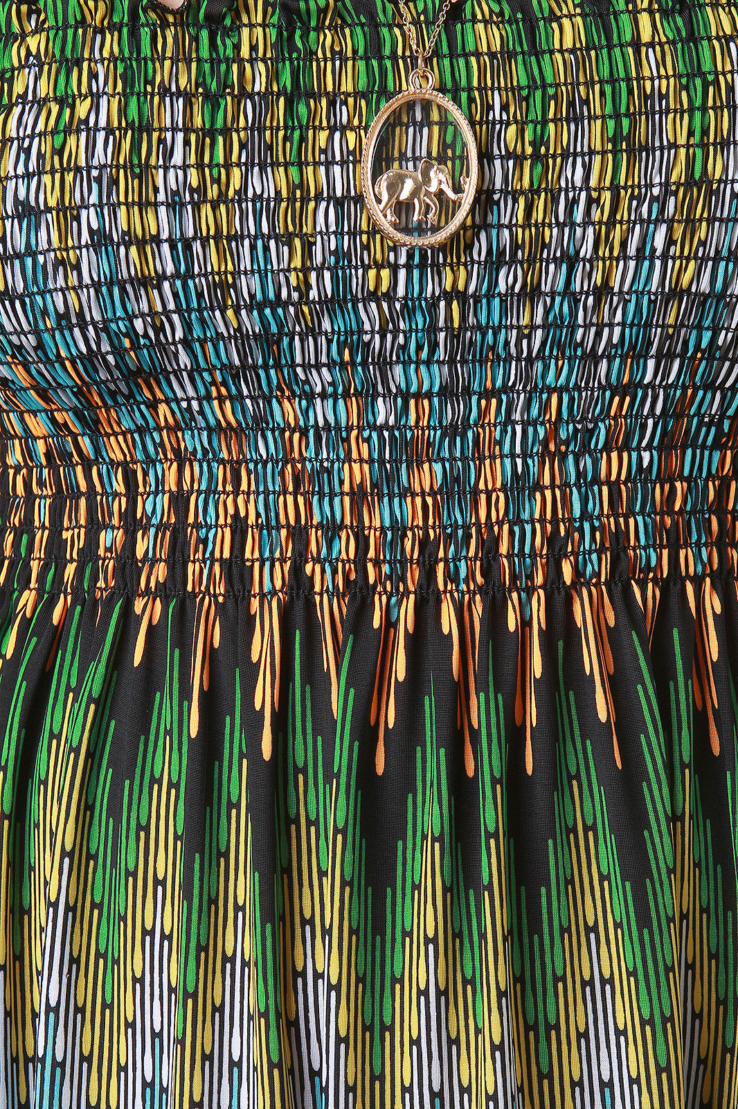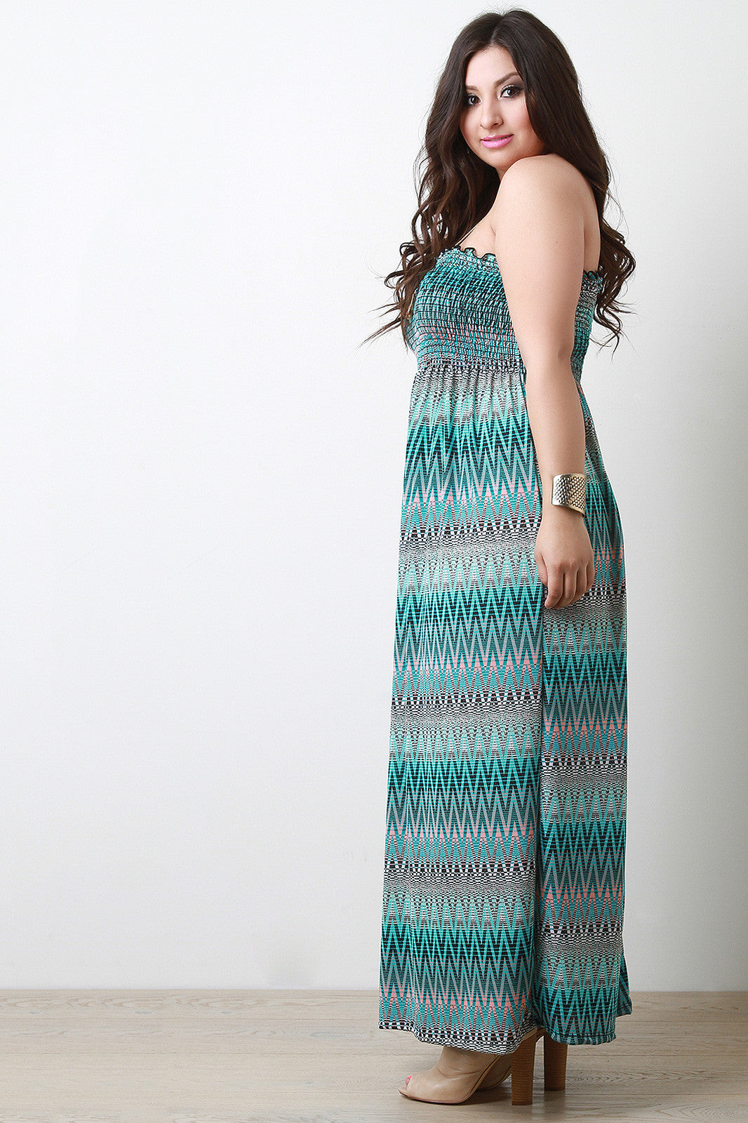 This plus size maxi dress features a zig zag pattern print, runched elasticized tube neckline, and flowy bottom. Accessories sold separately. Made in U.S.A. 95% Polyester, 5% Spandex.