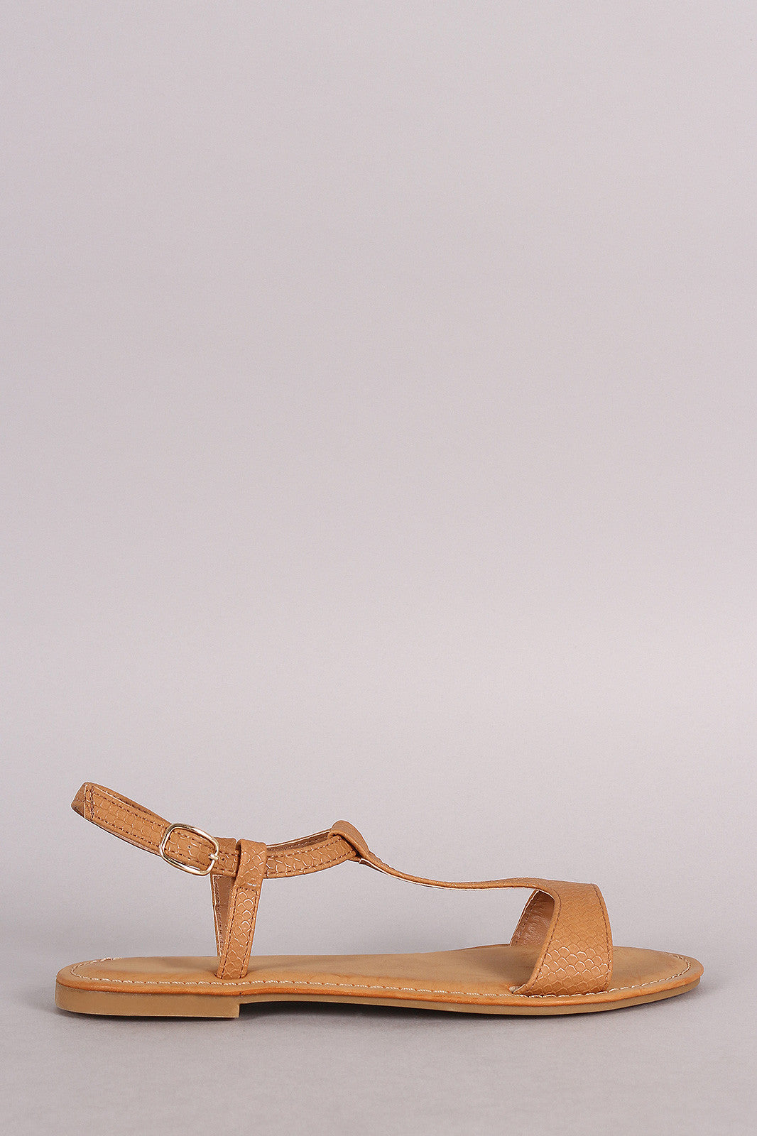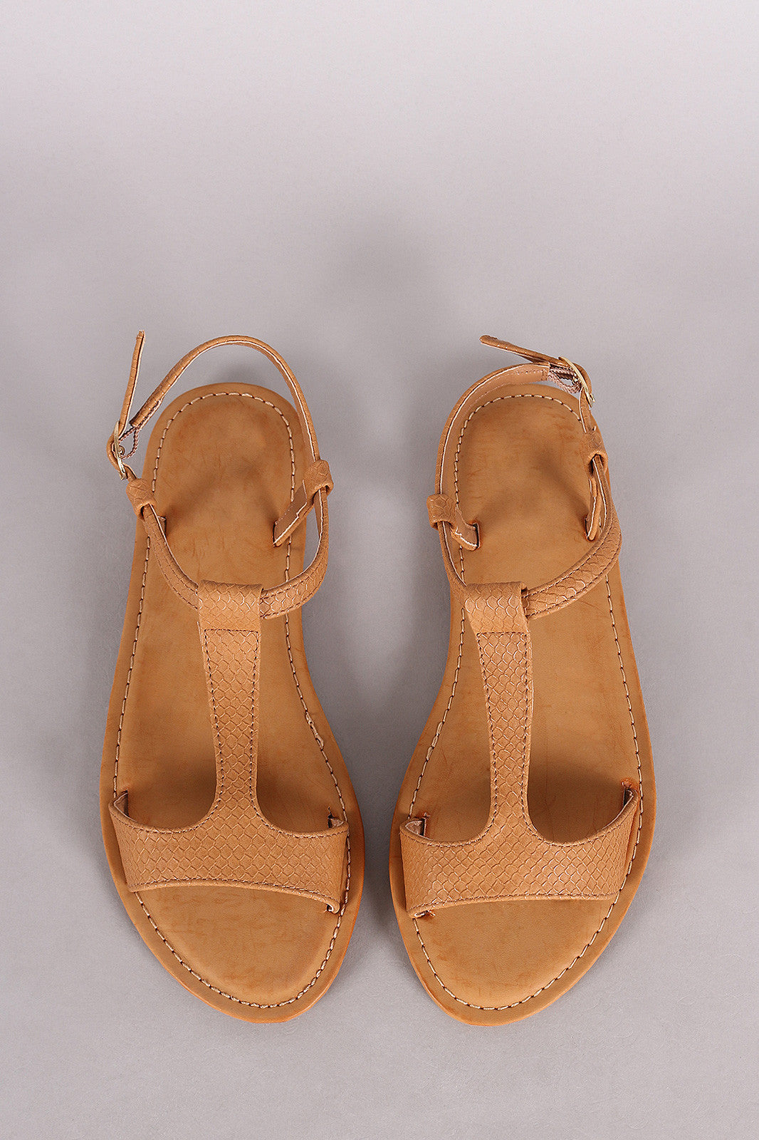 Bamboo Snake Embossed T-Strap Open Toe Flat Sandal