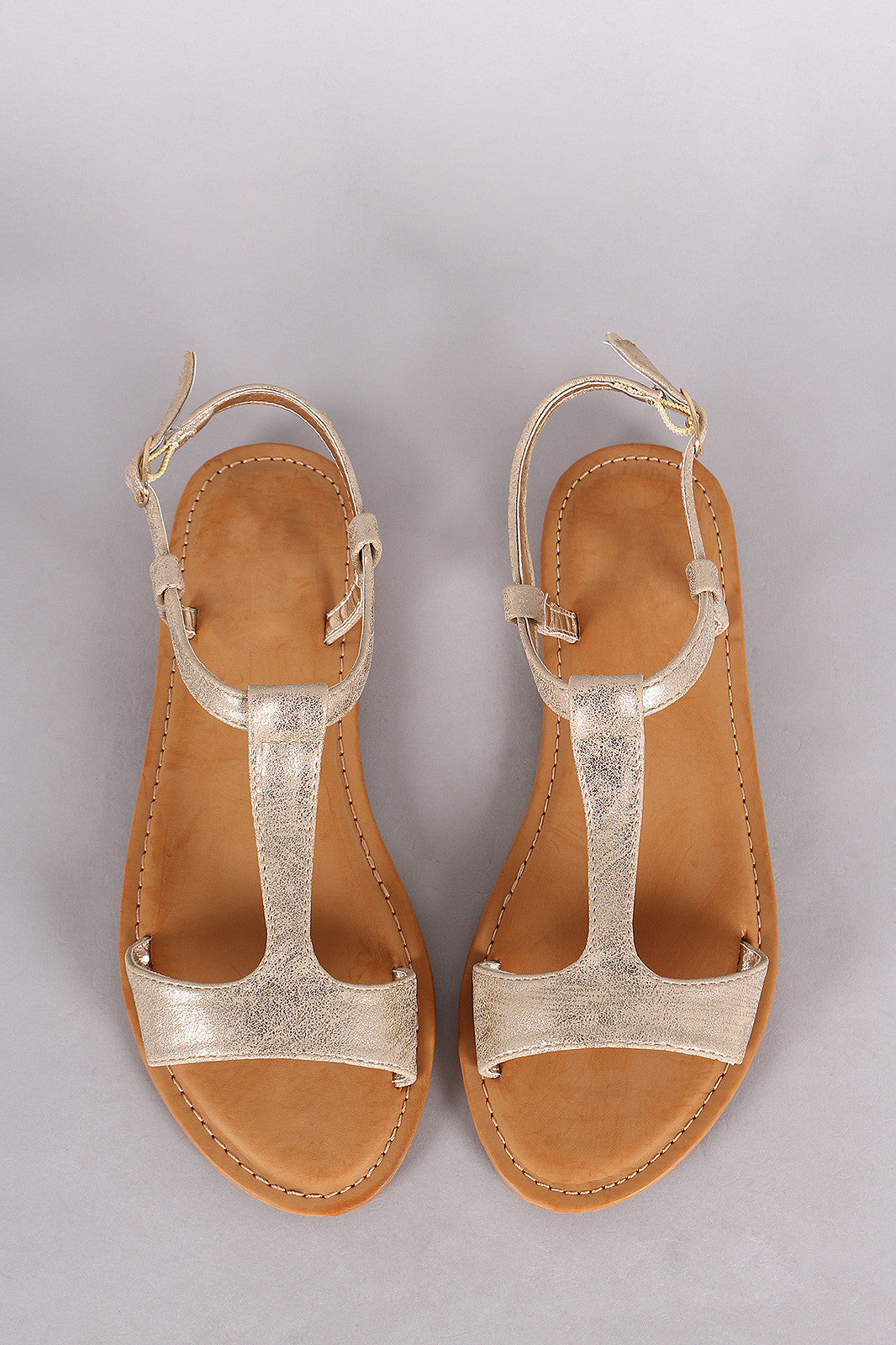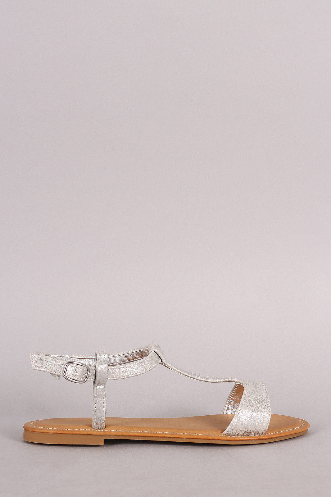 This open toe flat sandal features a T-strap construction, lightly padded insole, and adjustable ankle strap with buckle fastening.