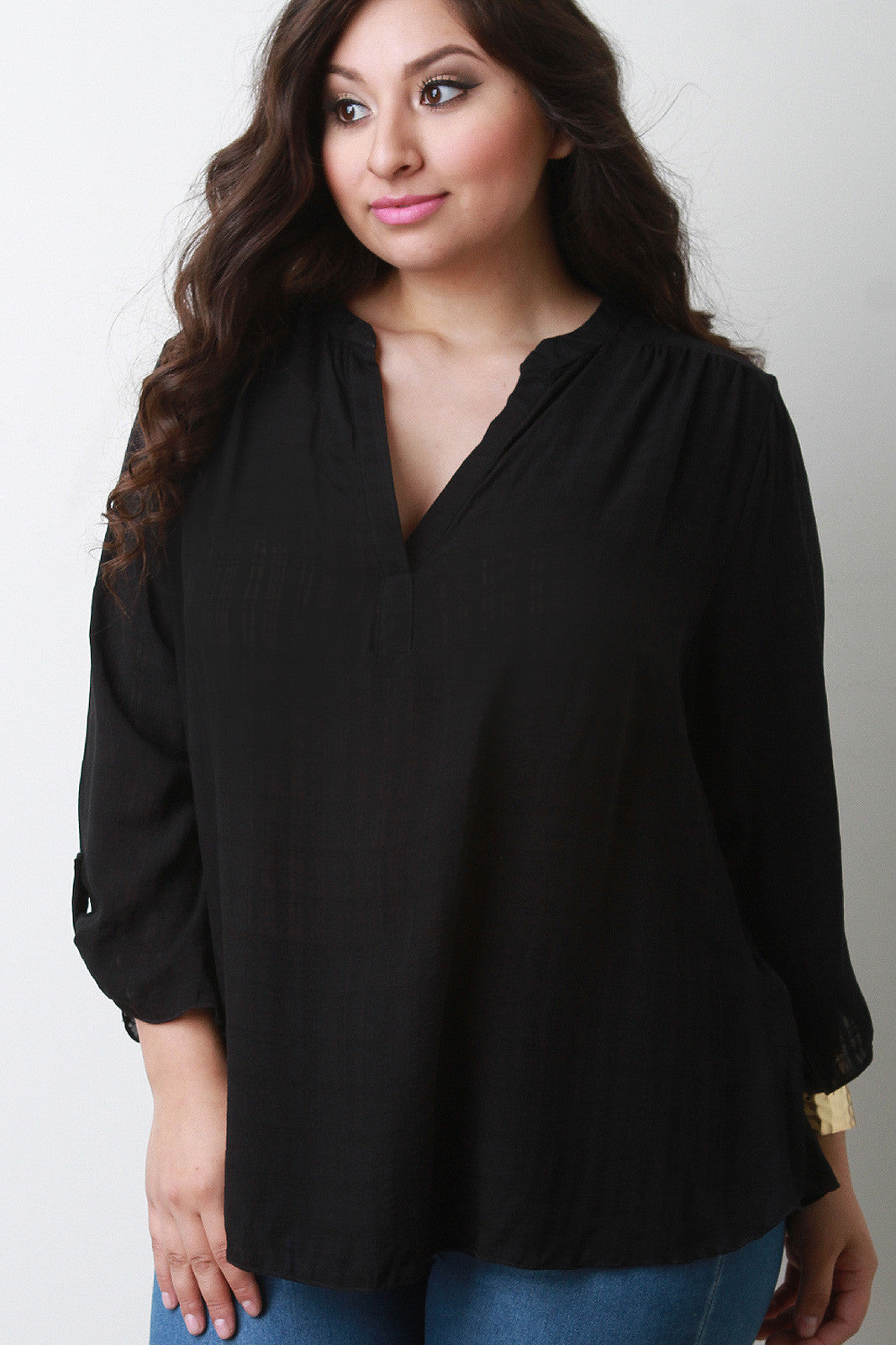 This plus size top features a woven knit fabrication, half placket neckline, long sleeves with button tab, and flat collar. Finished with a slight high low hemline. Accessories sold separately. Made in U.S.A. 100% Rayon