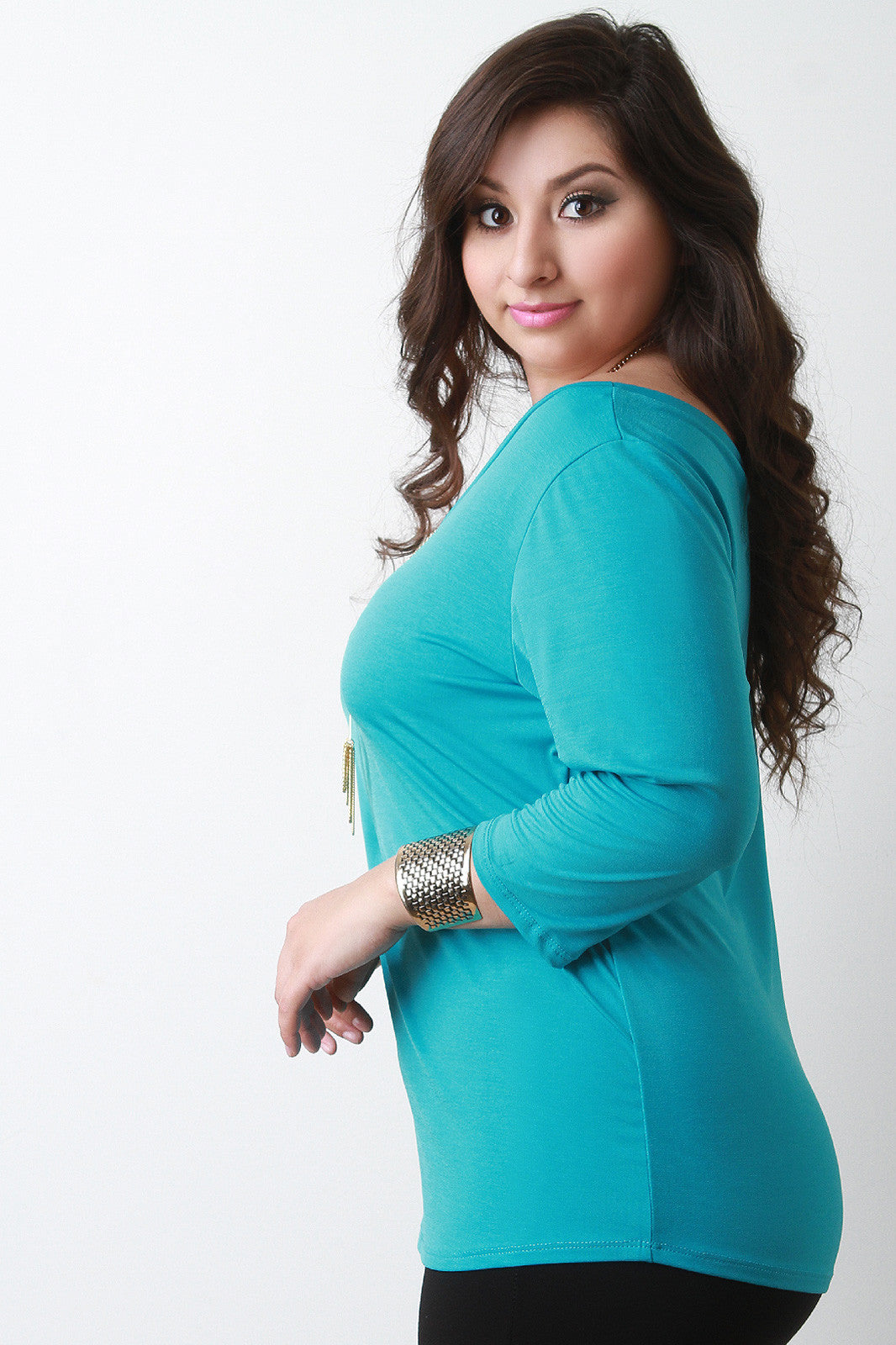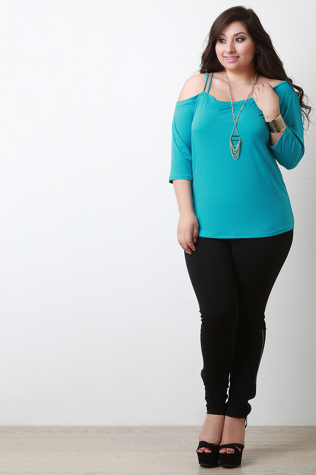 This plus size top has quarter sleeves with an off-the shoulder design on the right, featuring two shoulder straps. Flowy casual silhouette. Accessories sold separately. 95% Polyester. 5% Spandex.