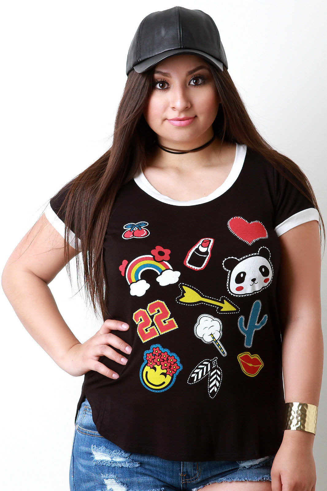 This playful plus size top features a jersey knit fabrication with contrasting trim, cute colorful various printed patches at front, round neckline, and short sleeves. Finished with a rounded hemline. Accessories sold separately. Made in U.S.A. 97% Rayon, 3% Spandex.