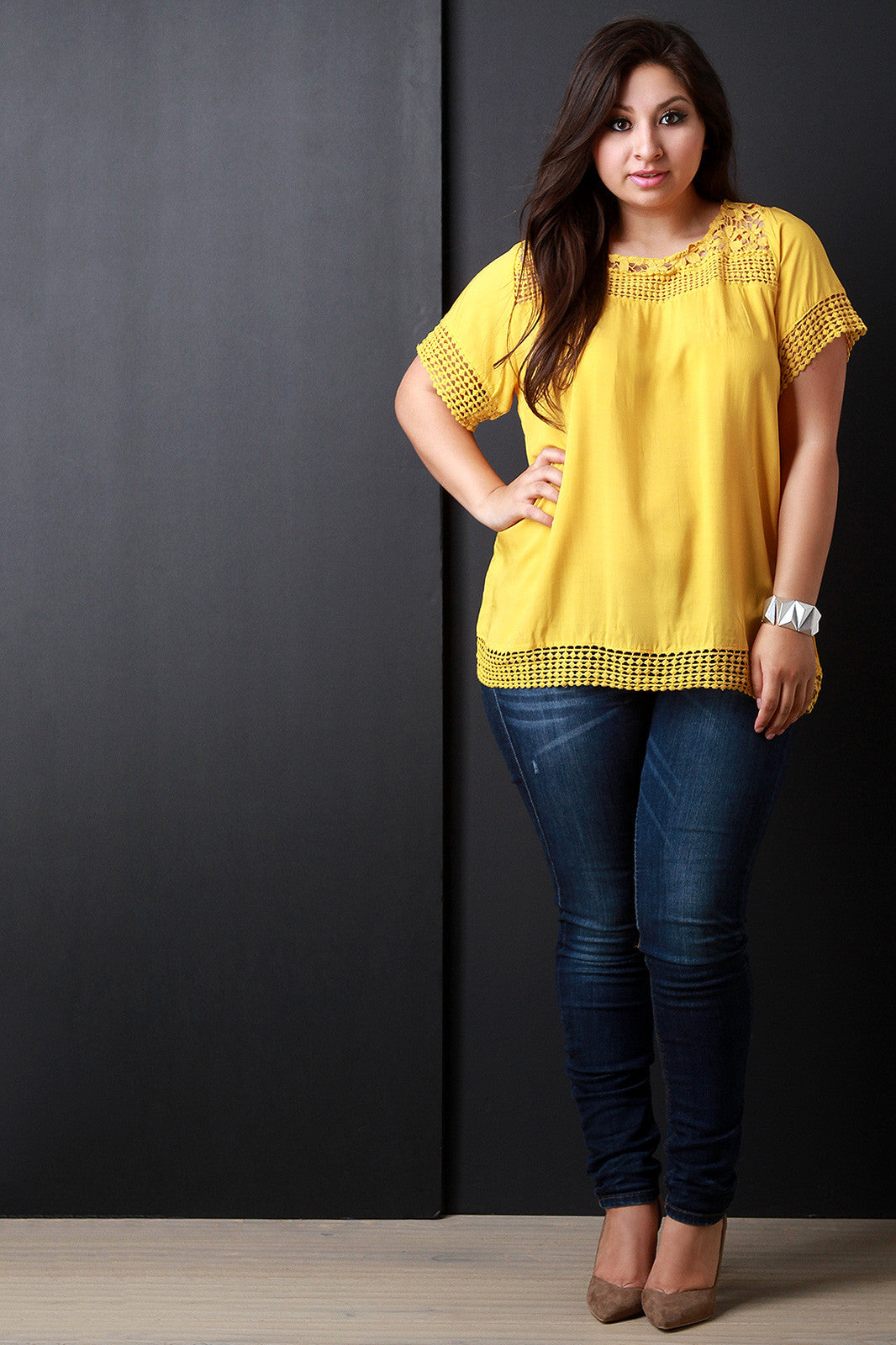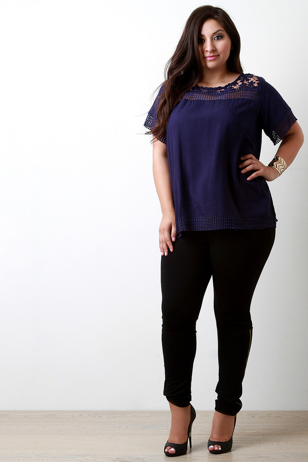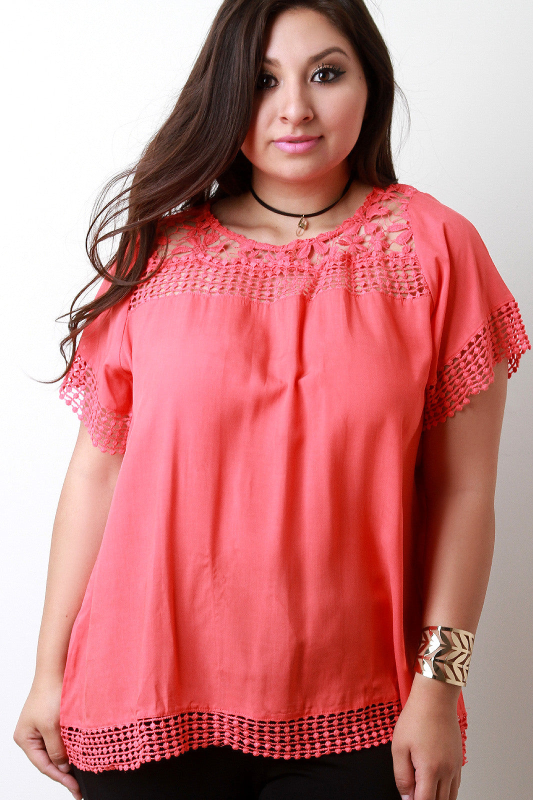 This plus size top features a woven fabrication, crochet insets detail and trim, round neckline, and relaxed fit. Accessories sold separately. 65% Cotton, 25% Polyester.