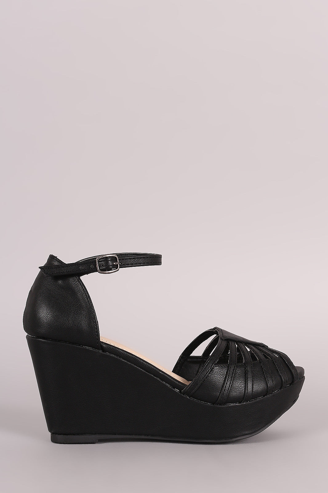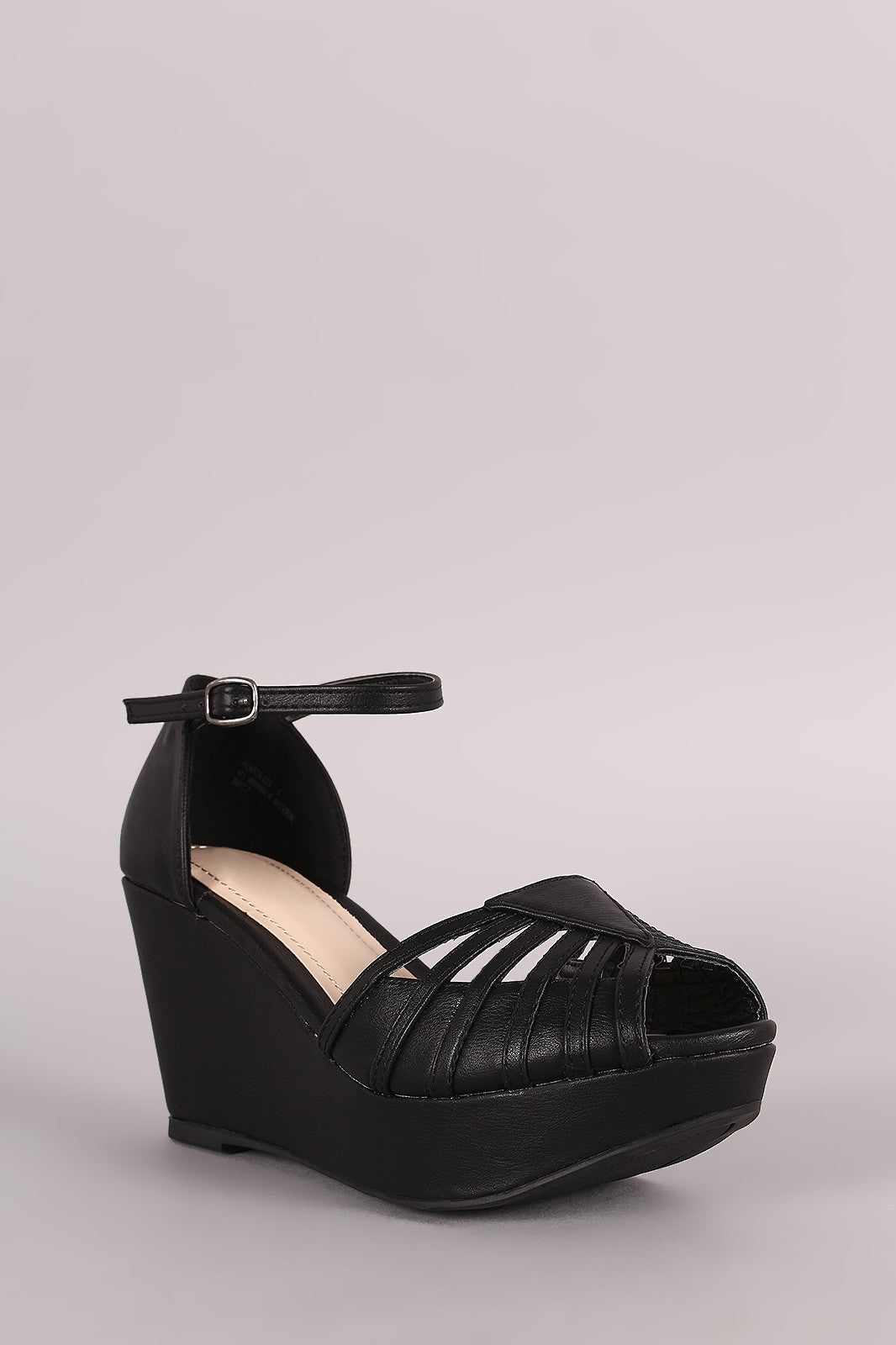 This peep toe wedge features a strappy caged design at front, adjustable ankle strap with buckle fastening, and wrapped platform wedge heel. Finished with a lightly padded insole for comfort.
