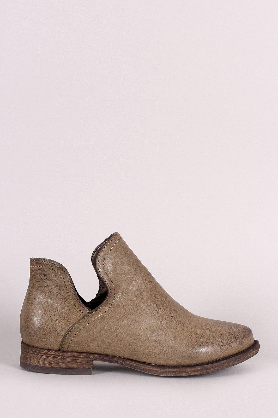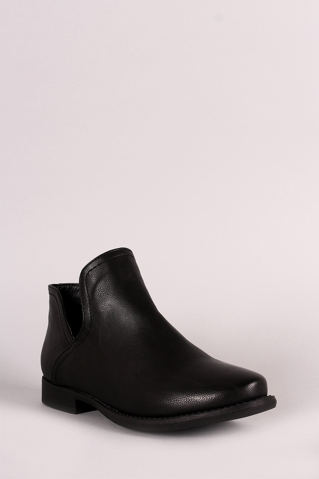 These booties feature a vegan leather upper with open side slit , almond toe silhouette, and low stacked heel. Finished with cushioned insole, smooth lining, and pull-on construction.