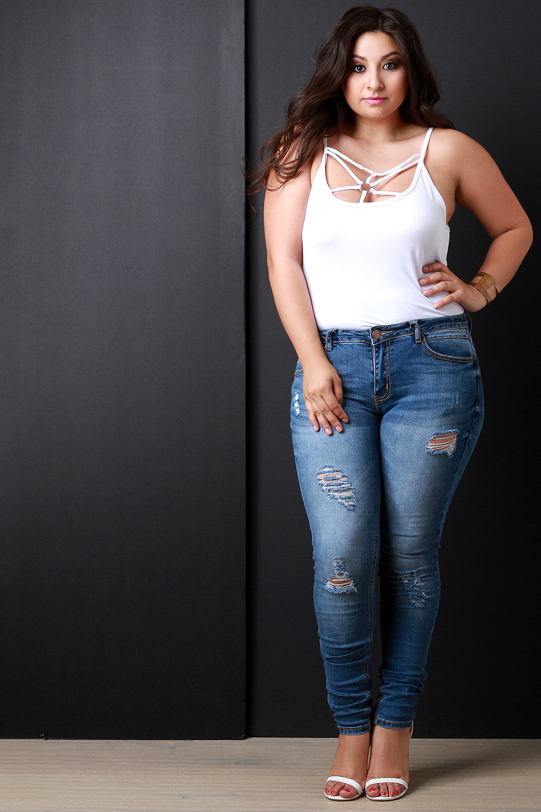 This plus size bodysuit features a sleeveless design, knit fabrication, scoop neckline, with a cage detail at neckline, finished with double snap closure at crotch. Accessories sold separately. Made in U.S.A. 95% Polyester, 5% Spandex.