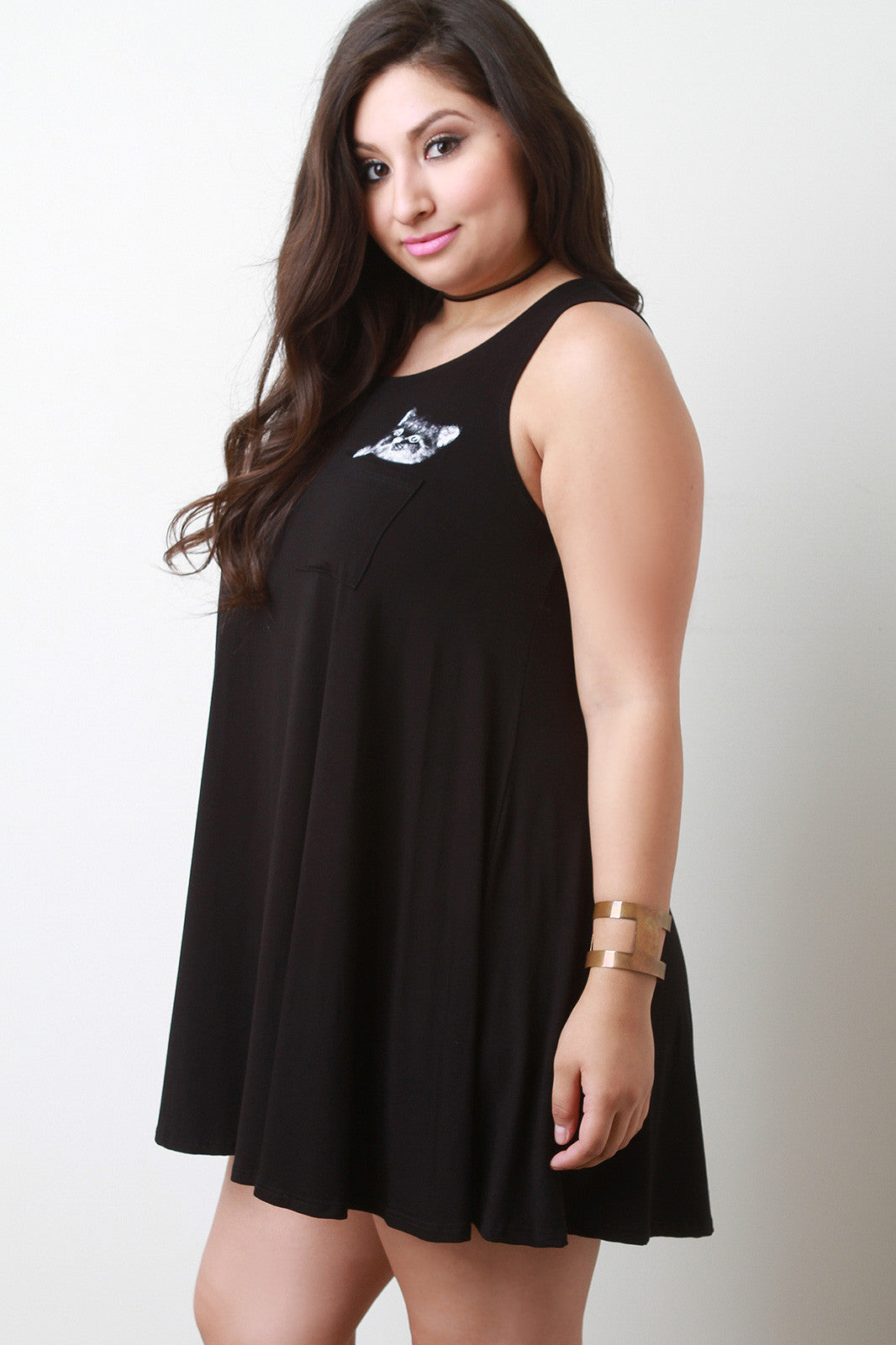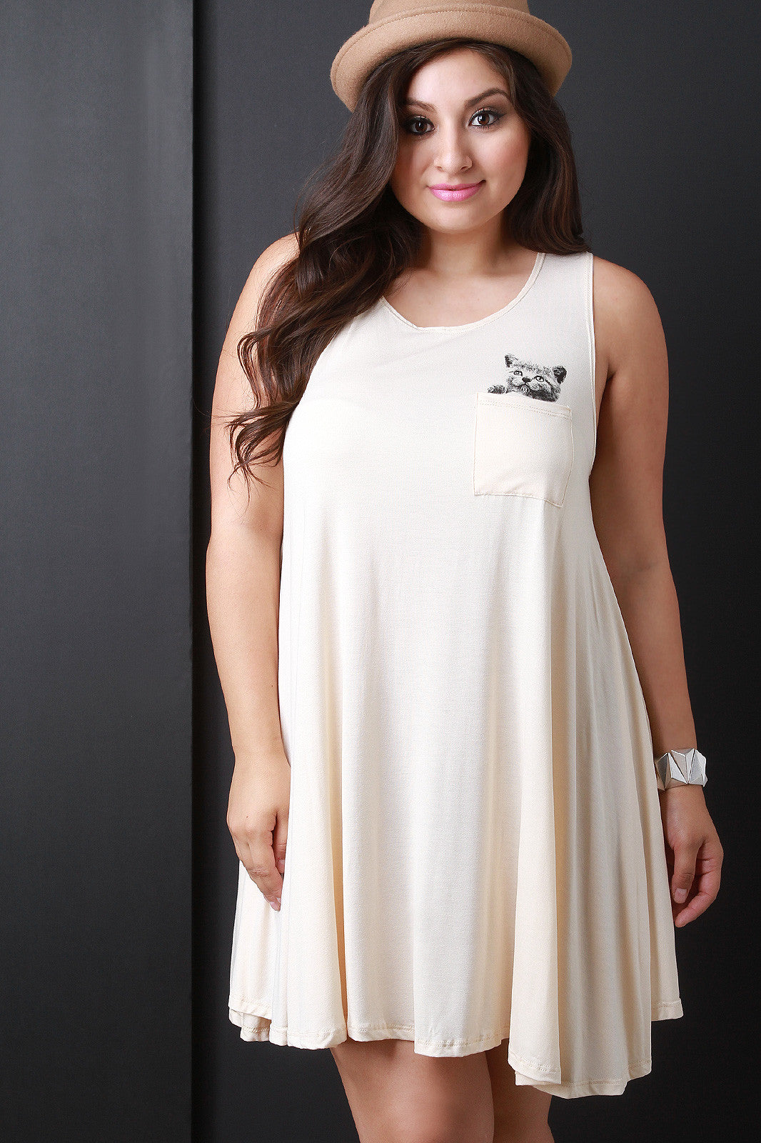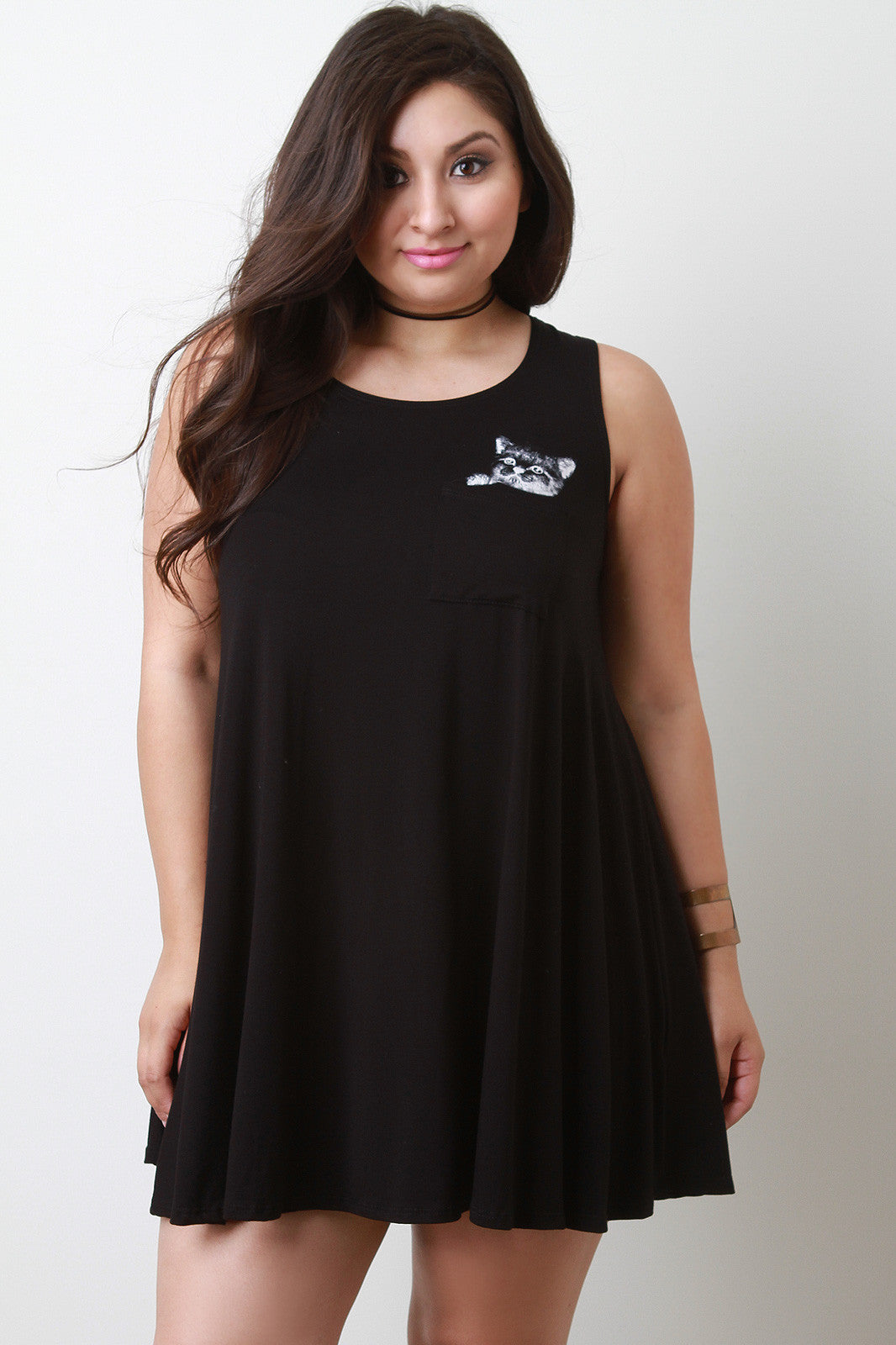 This plus size dress is trapeze silhouette with a scooped neck and sleeveless design. Soft knit. Flare cut. Unlined. Finish with a cat character print near open pocket. Accessories sold separately. 95% Rayon. 5% Spandex.