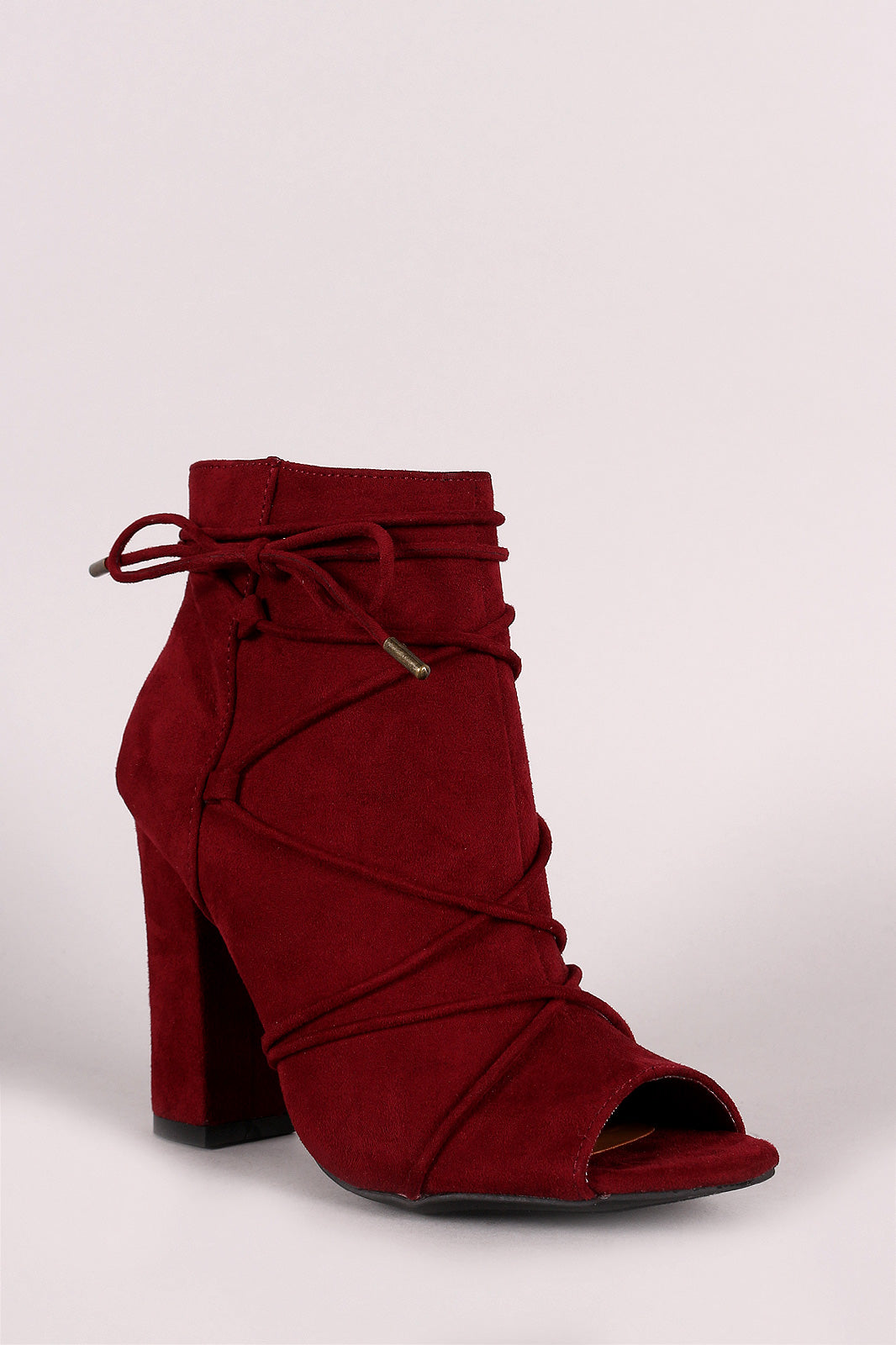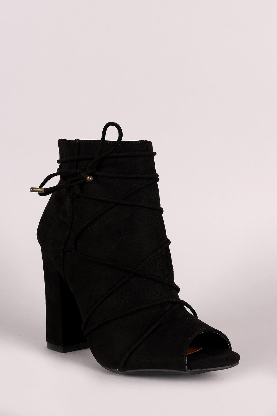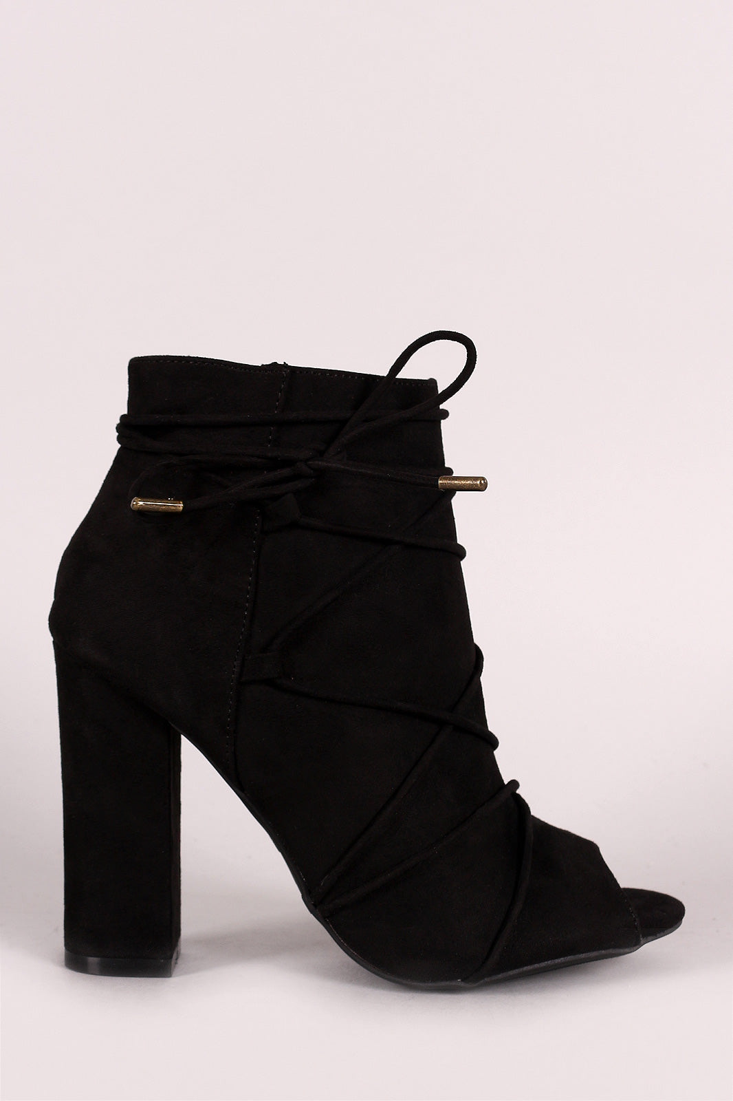 These chic booties feature a vegan suede upper, side-stitched strappy vamp with lace-up closure, peep toe silhouette, and wrapped chunky heel. Finished with a lightly cushioned insole and side zipper fastener for easy on/off.