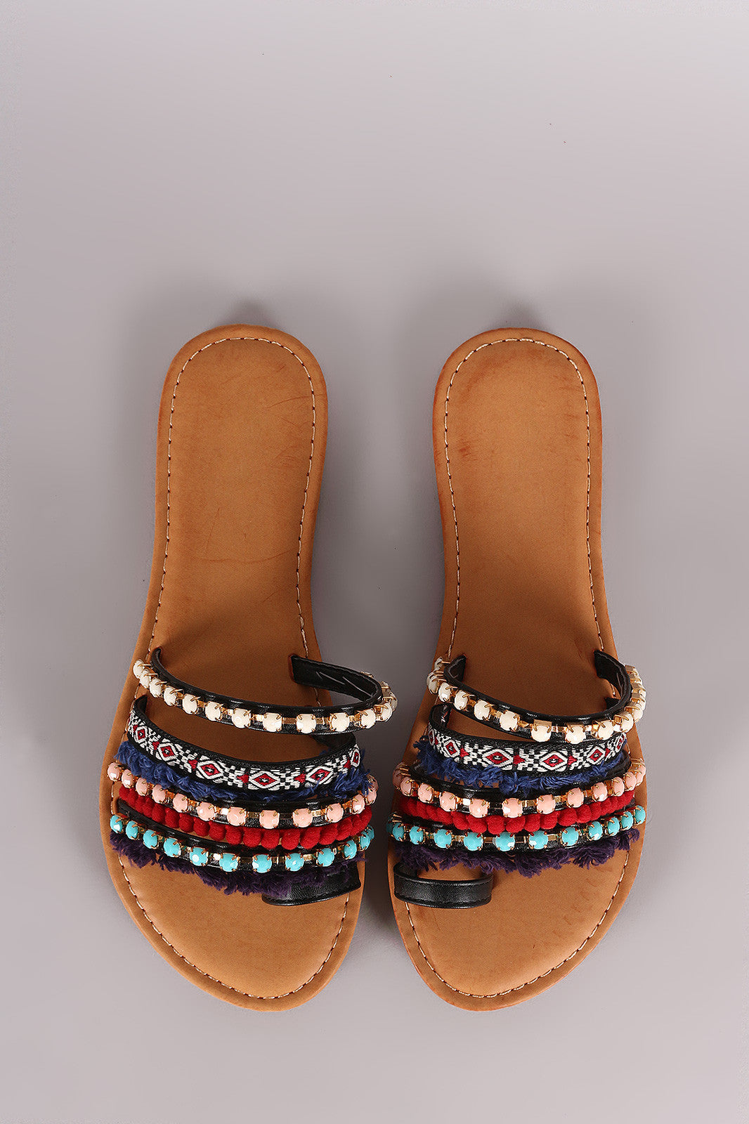 This tribal inspired flat sandal feature a soft toe loop, strappy construction with jewels/fray crochet detailing, lightly padded insole, and easy slide style.