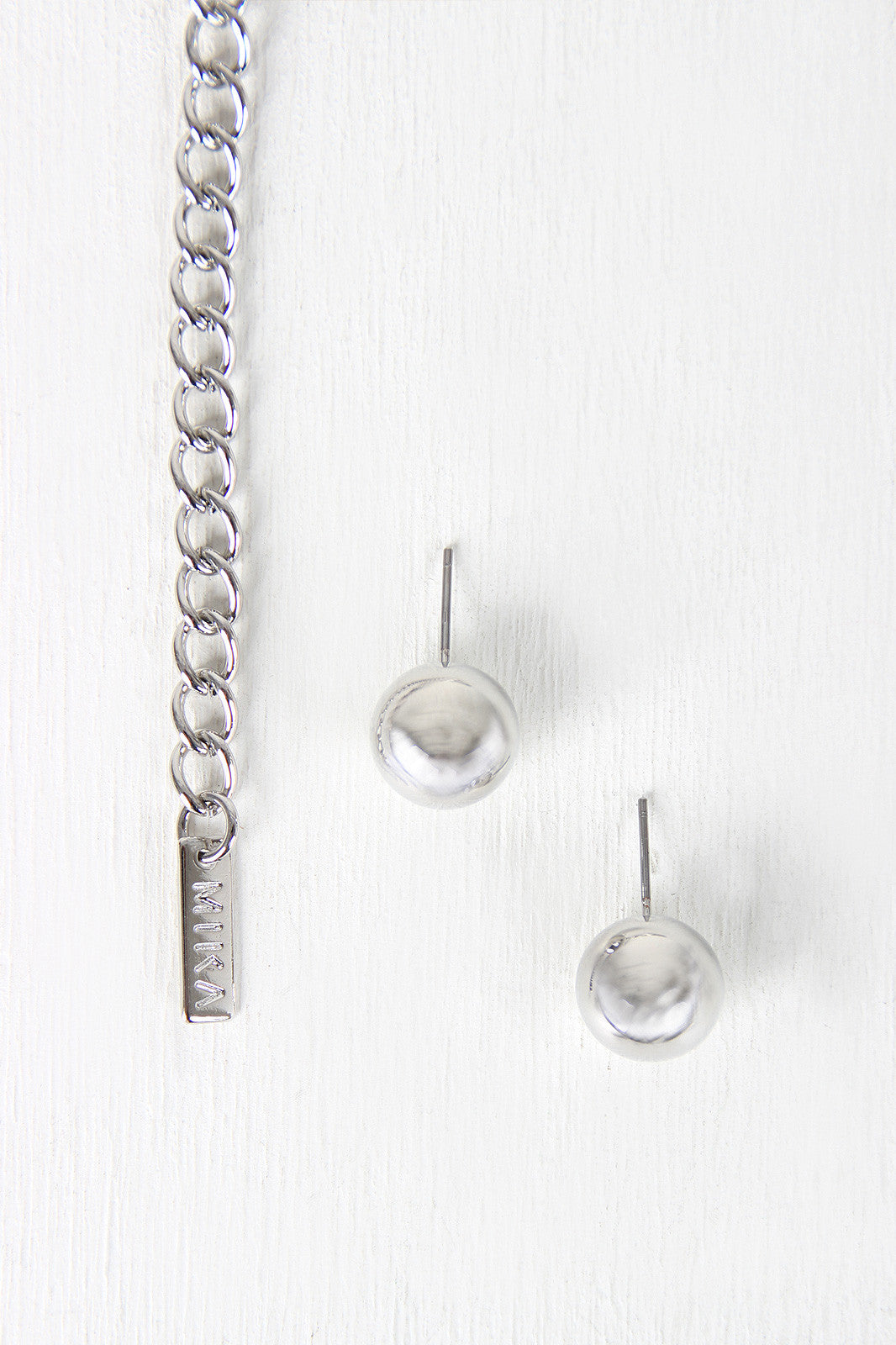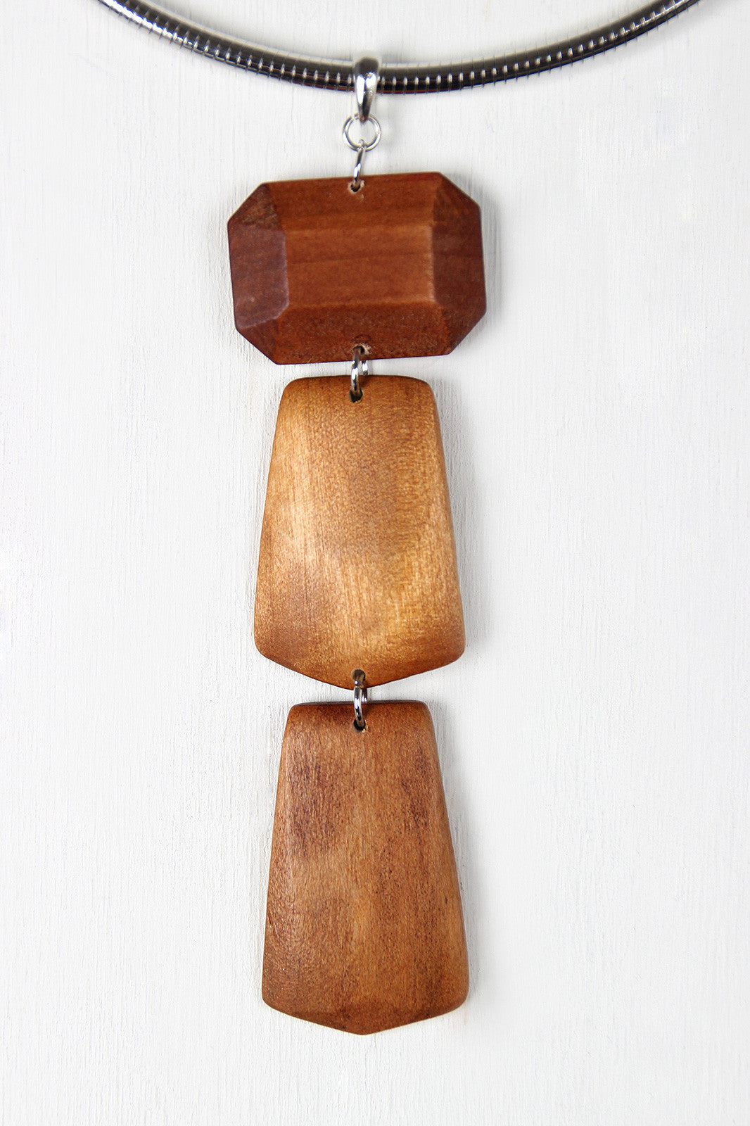 This statement necklace features an omega style chain with a high polished finish, gem shaped wood pendants, matching earrings and an adjustable lobster claw closure.