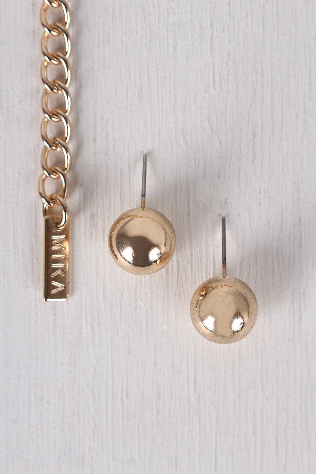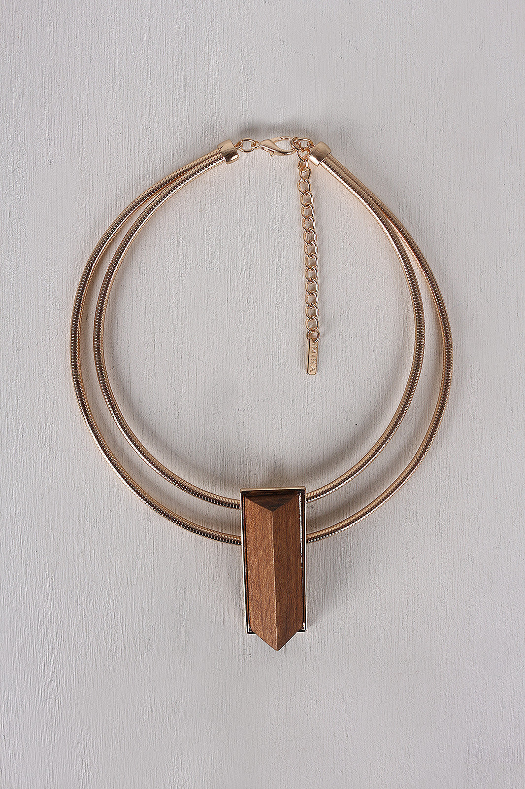 This collar necklace features a double snake chain, high polished metallic finish, wooden triangle block pendant, with an adjustable lobster claw closure. Includes matching earrings.