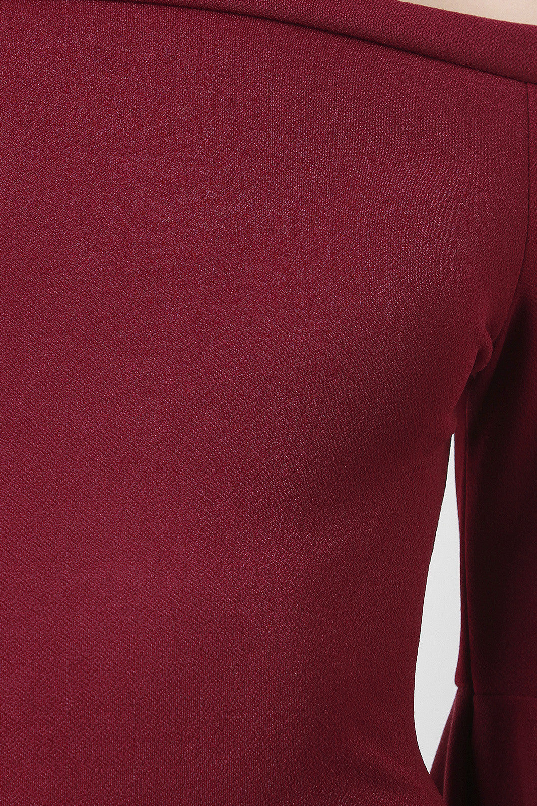 This  midi dress  features stretch fabric, off the shoulder neckline, long bell sleeves, and side slit. Accessories sold separately. Made in USA. 95% Polyester, 5% Spandex.