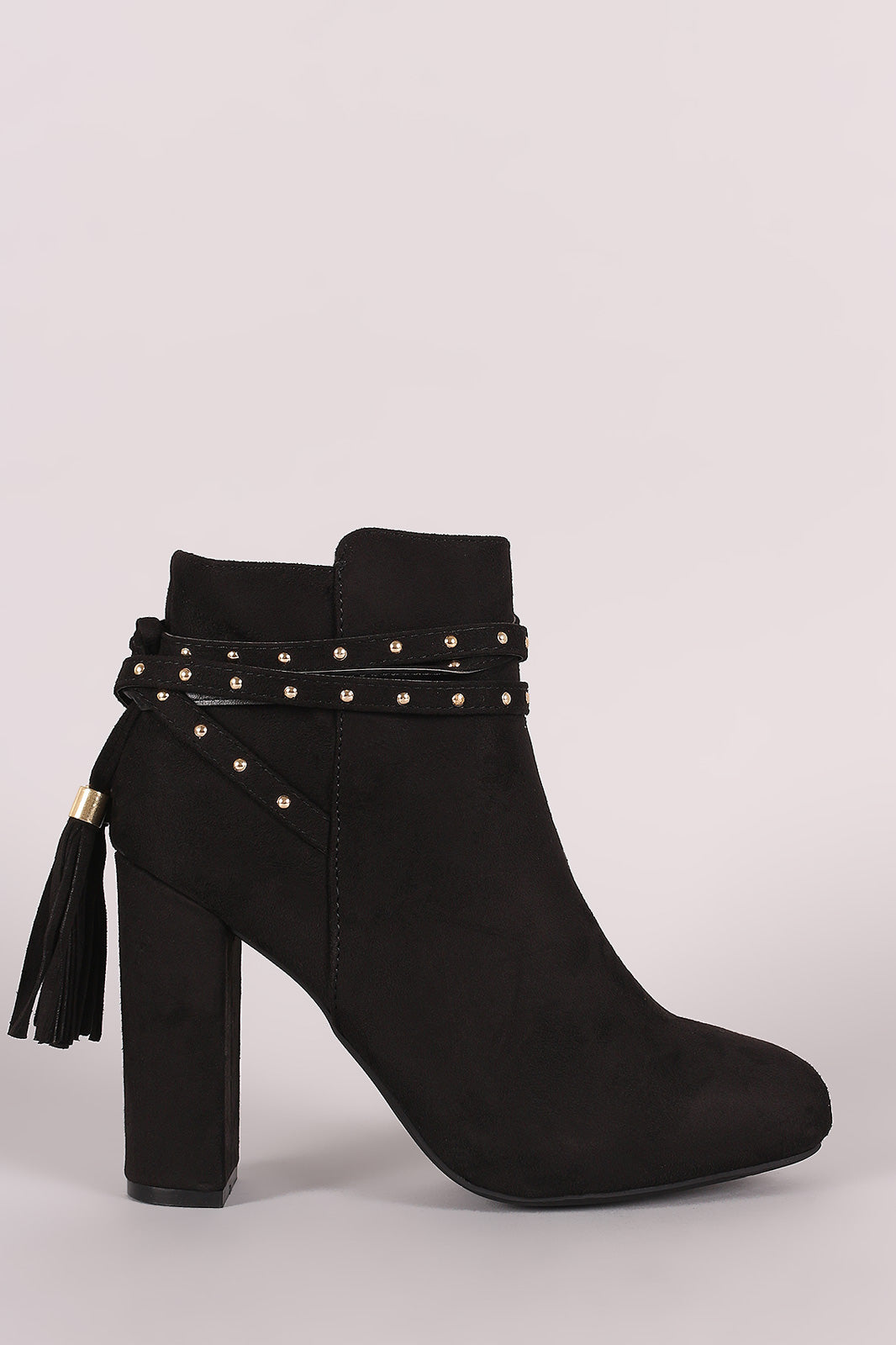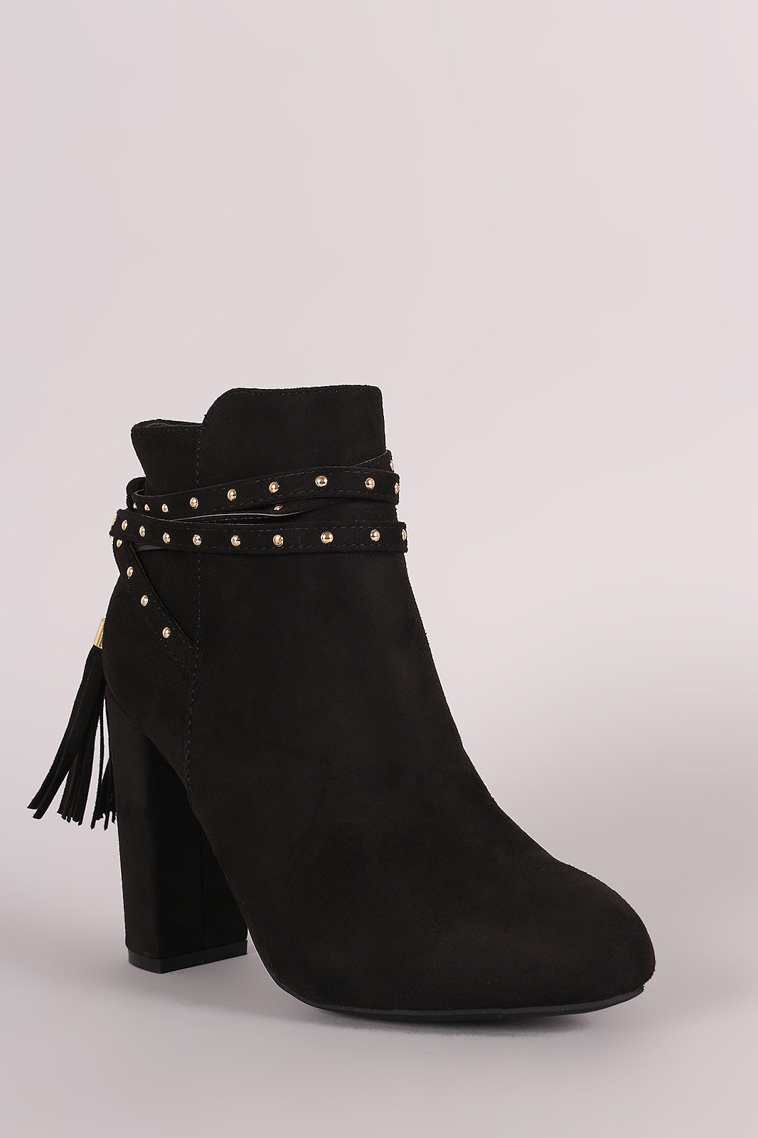 These chic ankle boots feature a round toe silhouette, wrapped around studded ankle straps with back tassel accent, and chunky heel. Finished with a cushioned insole, smooth lining, and side zipper closure for easy on/off.