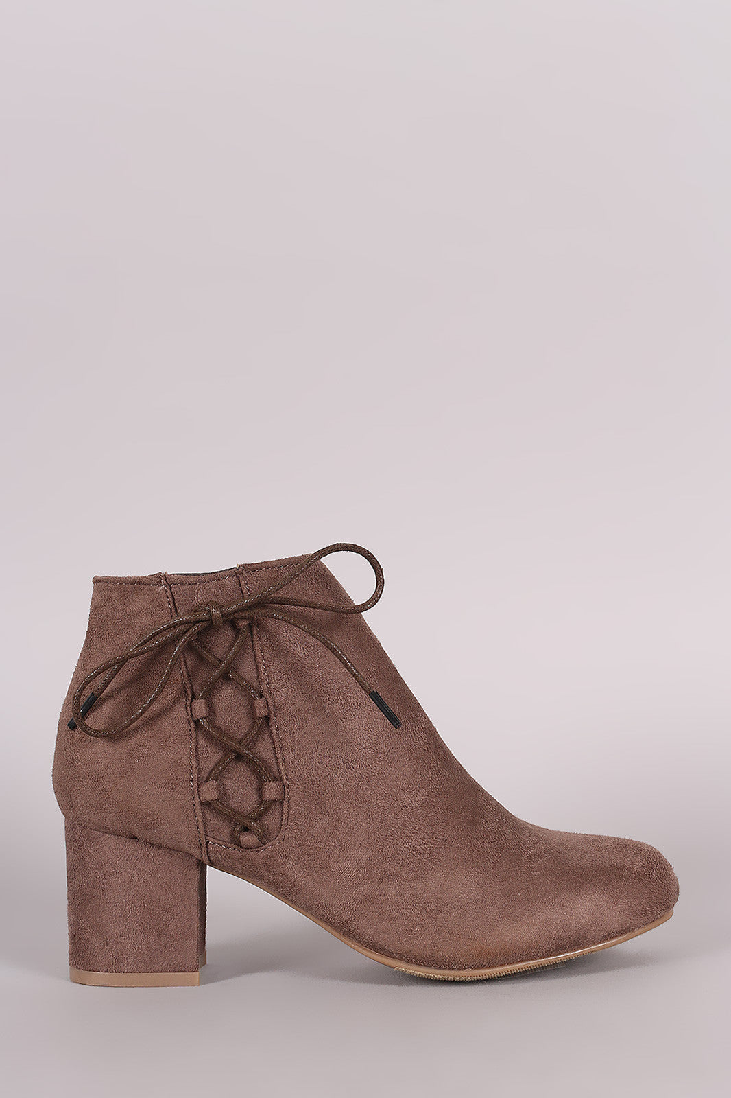 These booties feature a lace up side design. Round toe. Light faux fur lining. Finished on a chunky heel.