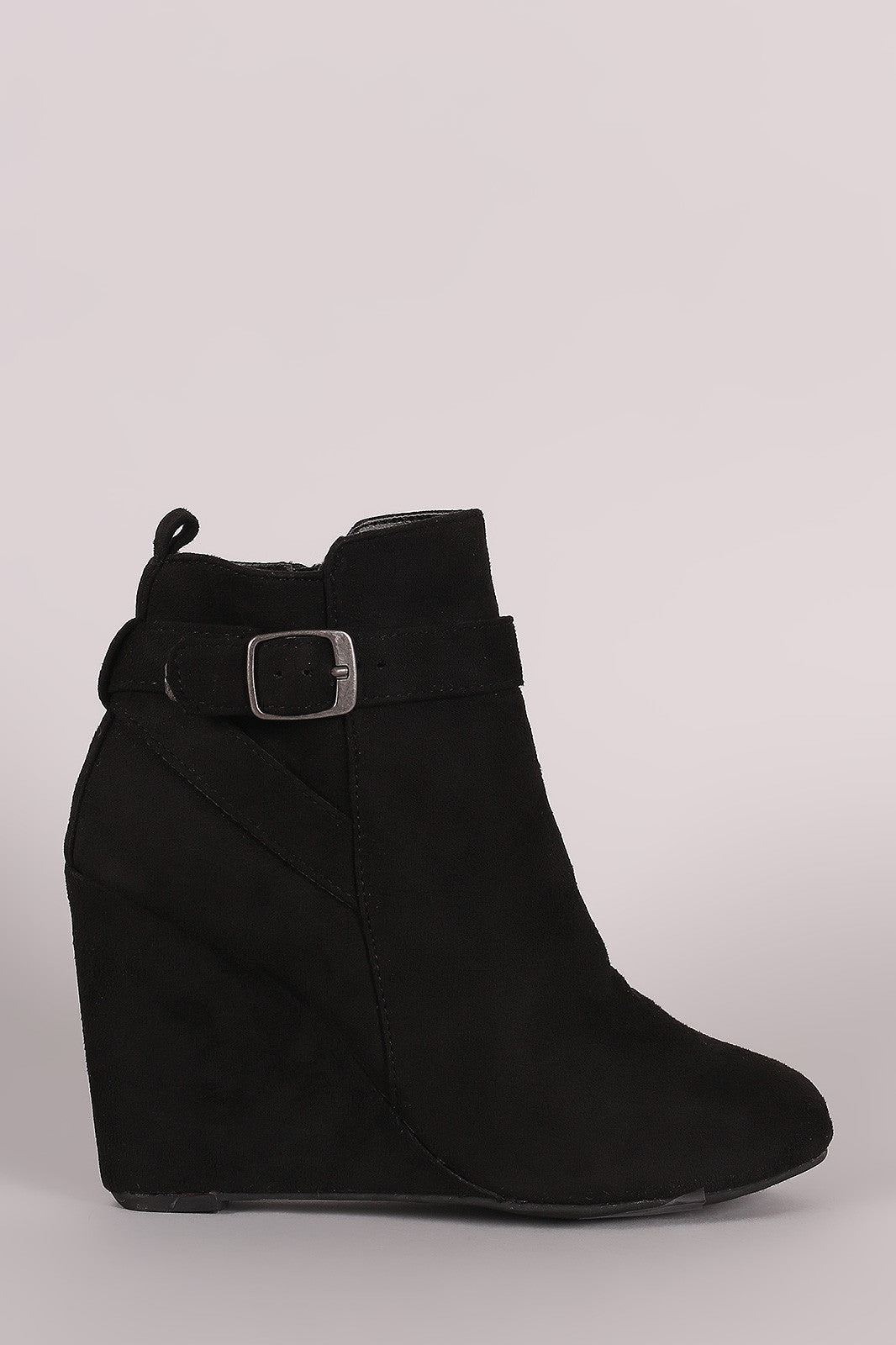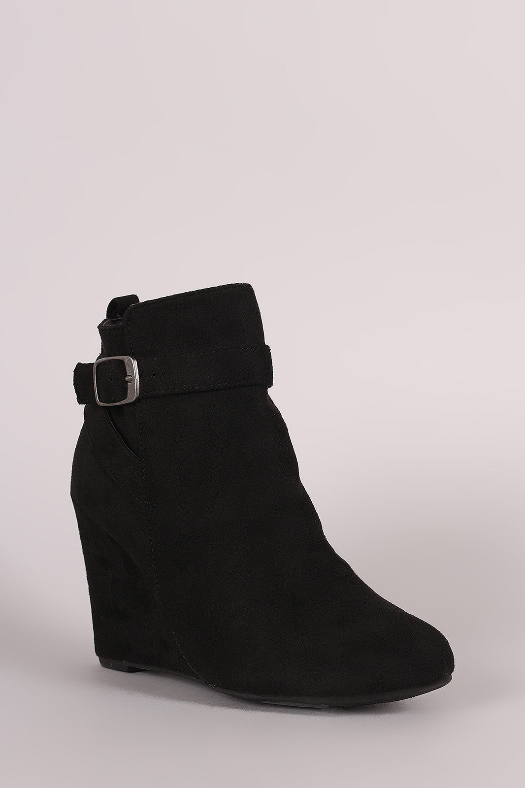 These ankle booties feature an adjustable wrapped ankle strap. Almond toe silhouette. Faux fur lining. Finished on a wrapped wedge.