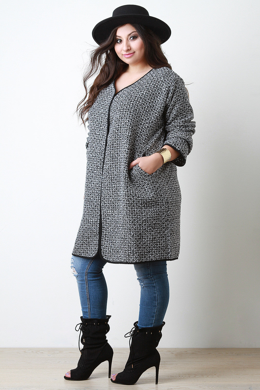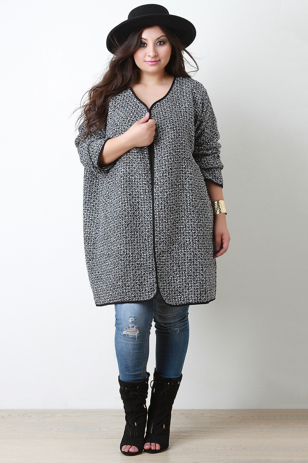 This chic plus size coat features s woven fabrication, with a sparkle thread woven in, contrast bias tape trim,front welt pockets, open front, finished with a long knee length hem.