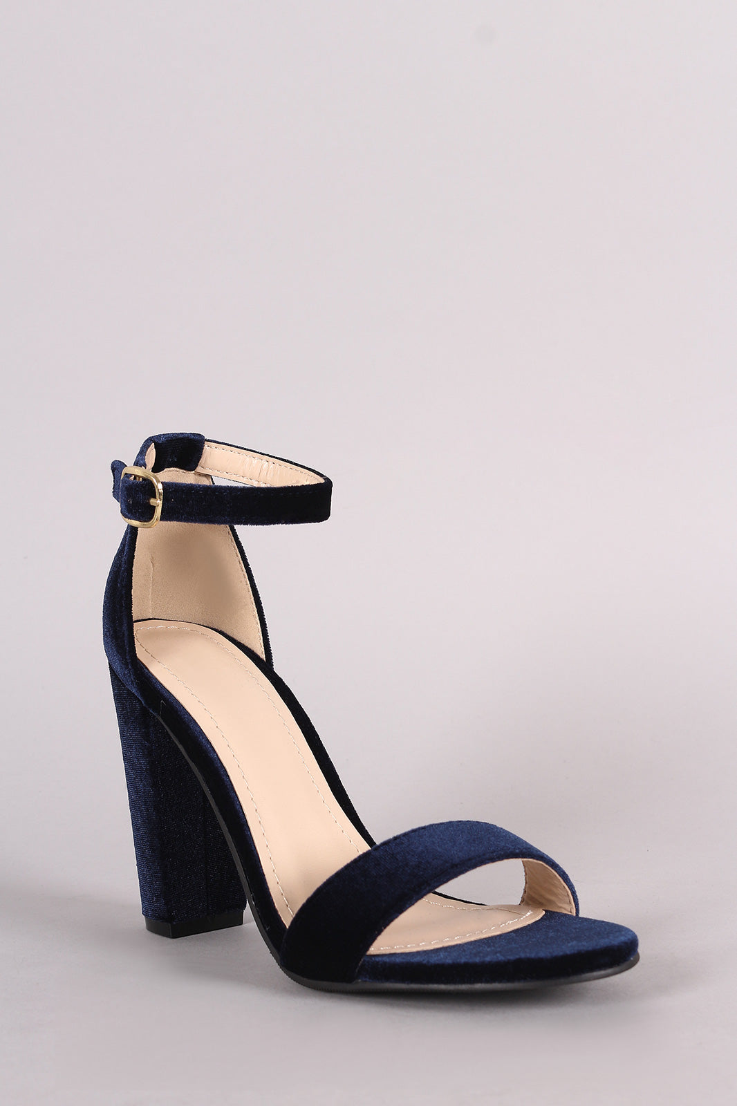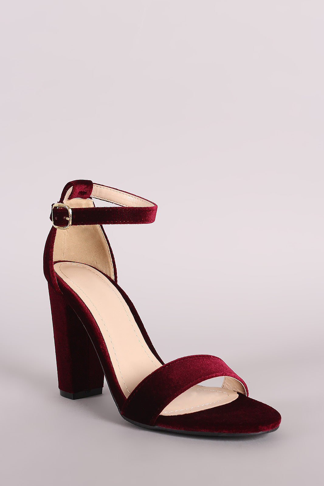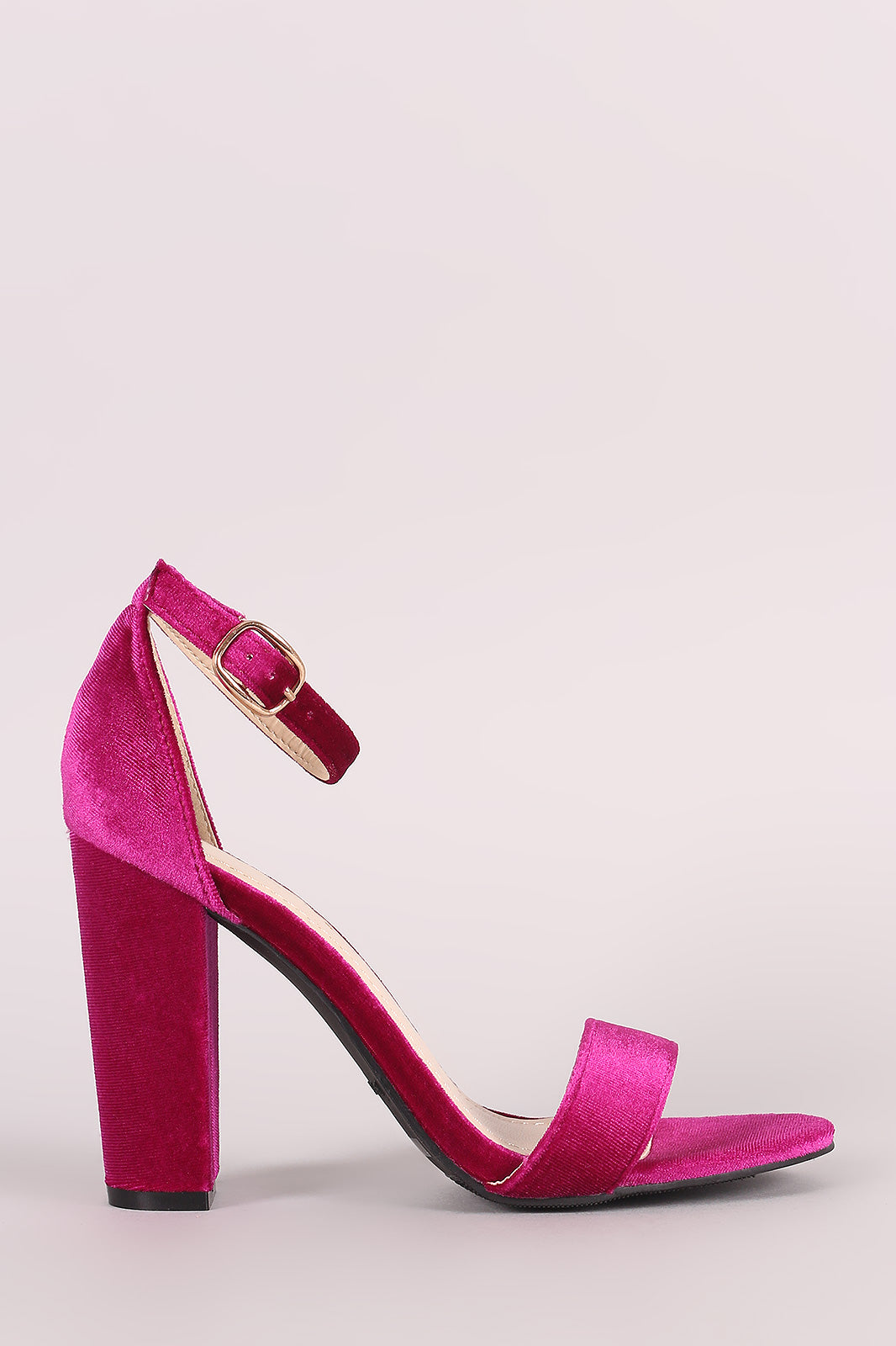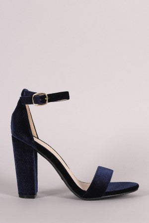 This flawless open toe heel features a single band across vamp, chunky wrapped heel, lightly padded insole, and adjustable ankle strap with buckle closure.