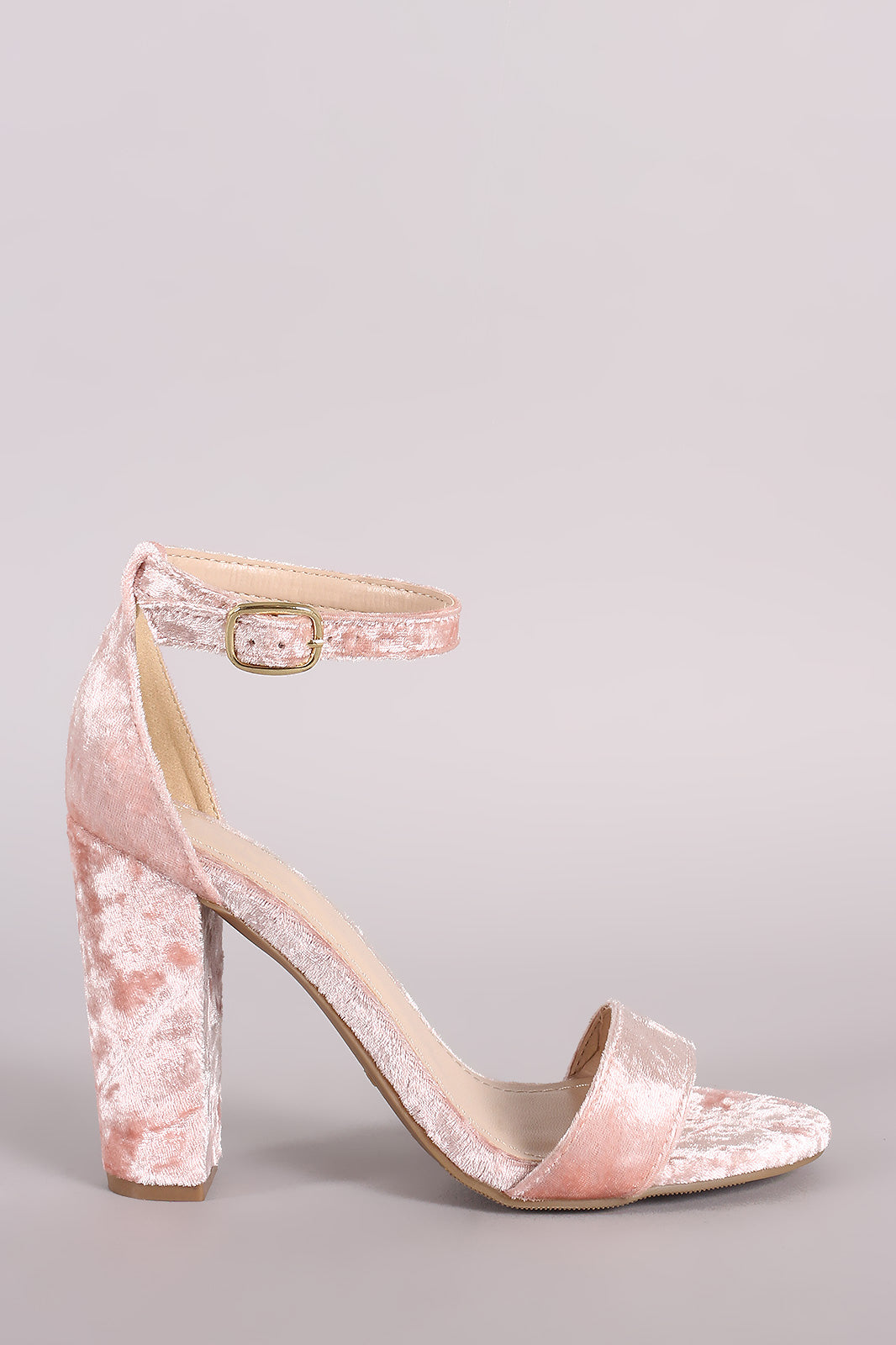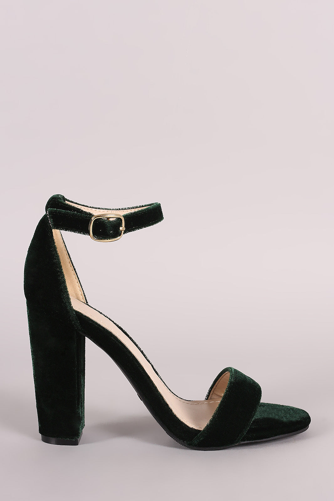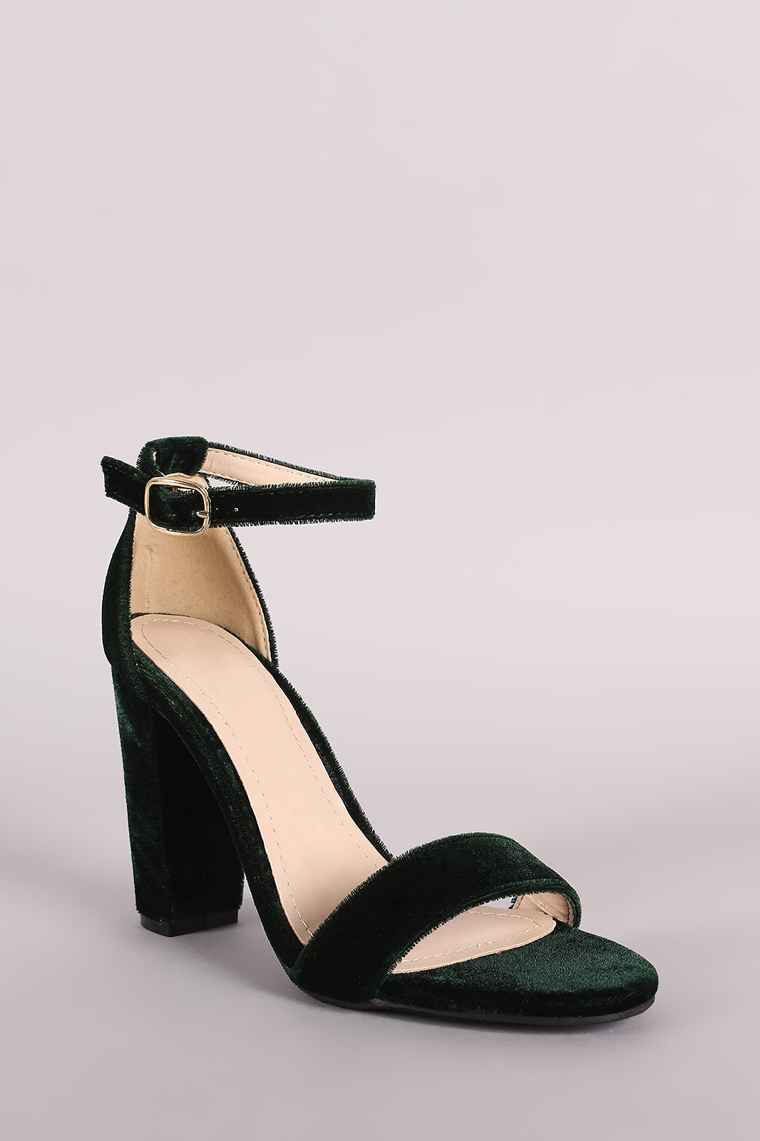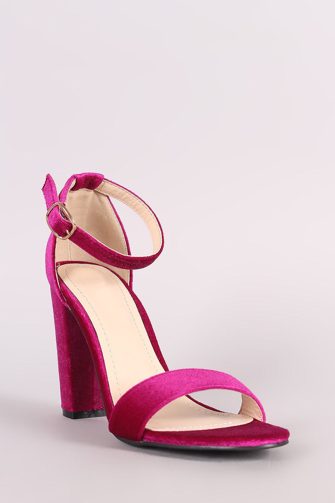 This flawless open toe heel features a single band across vamp, chunky wrapped heel, lightly padded insole, and adjustable ankle strap with buckle closure.