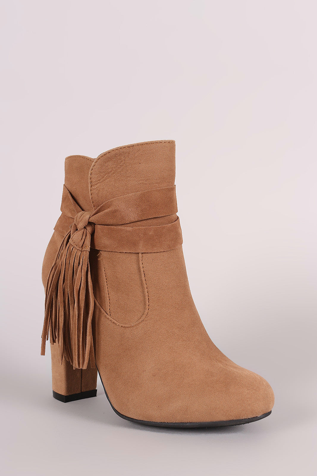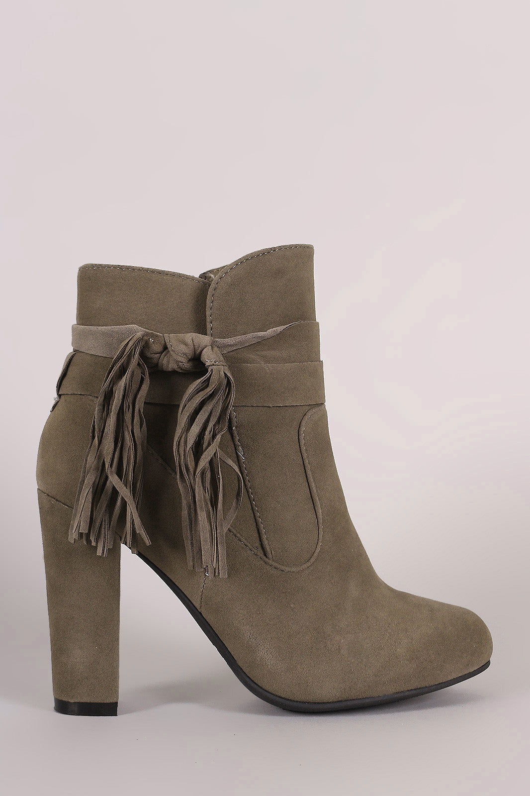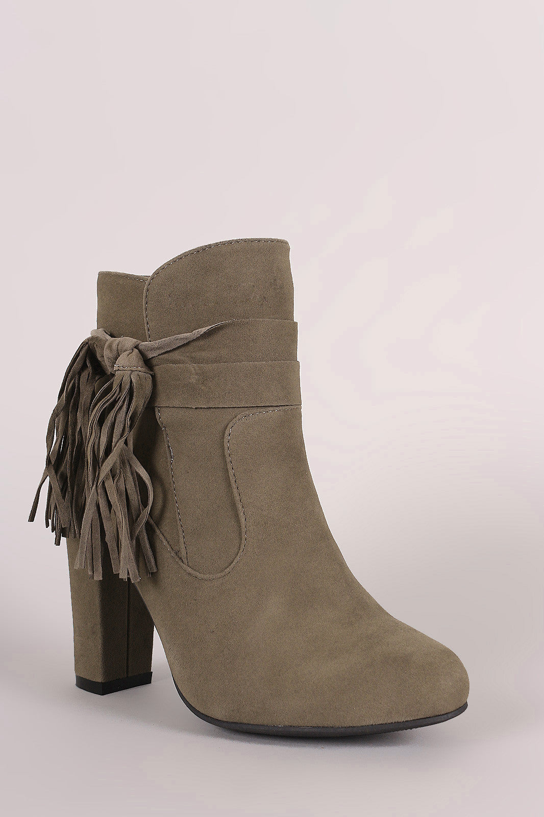 Bamboo Suede Knotted Side Fringe Chunky Heeled Booties