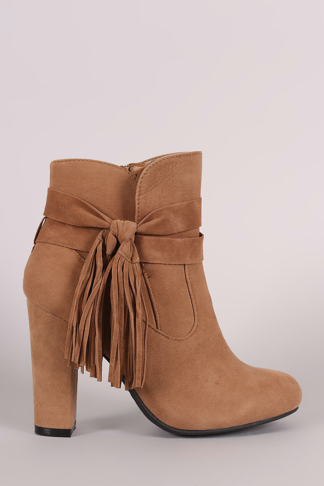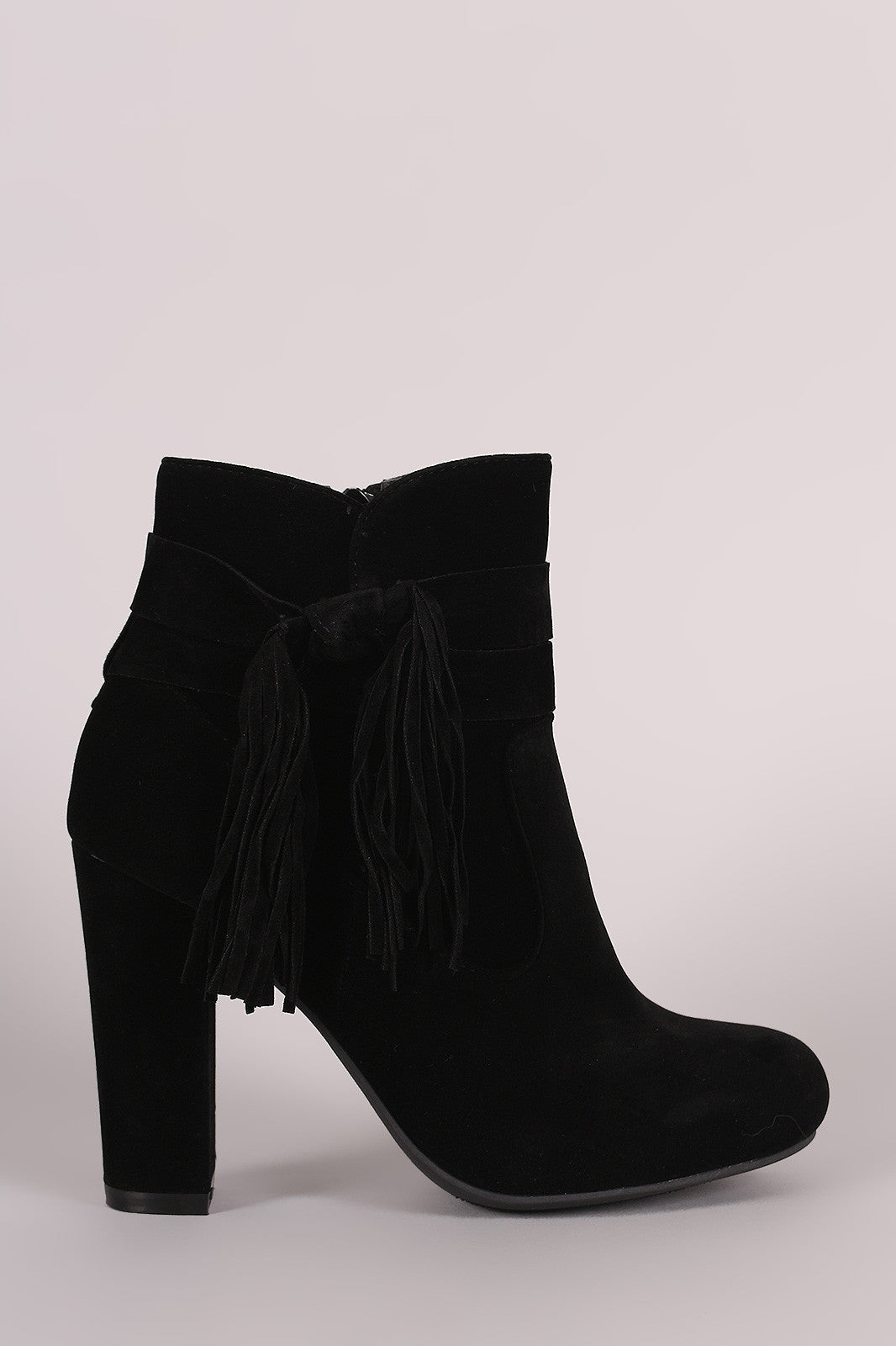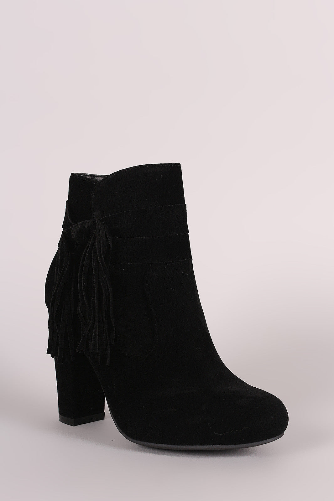 Bamboo Suede Knotted Side Fringe Chunky Heeled Booties
