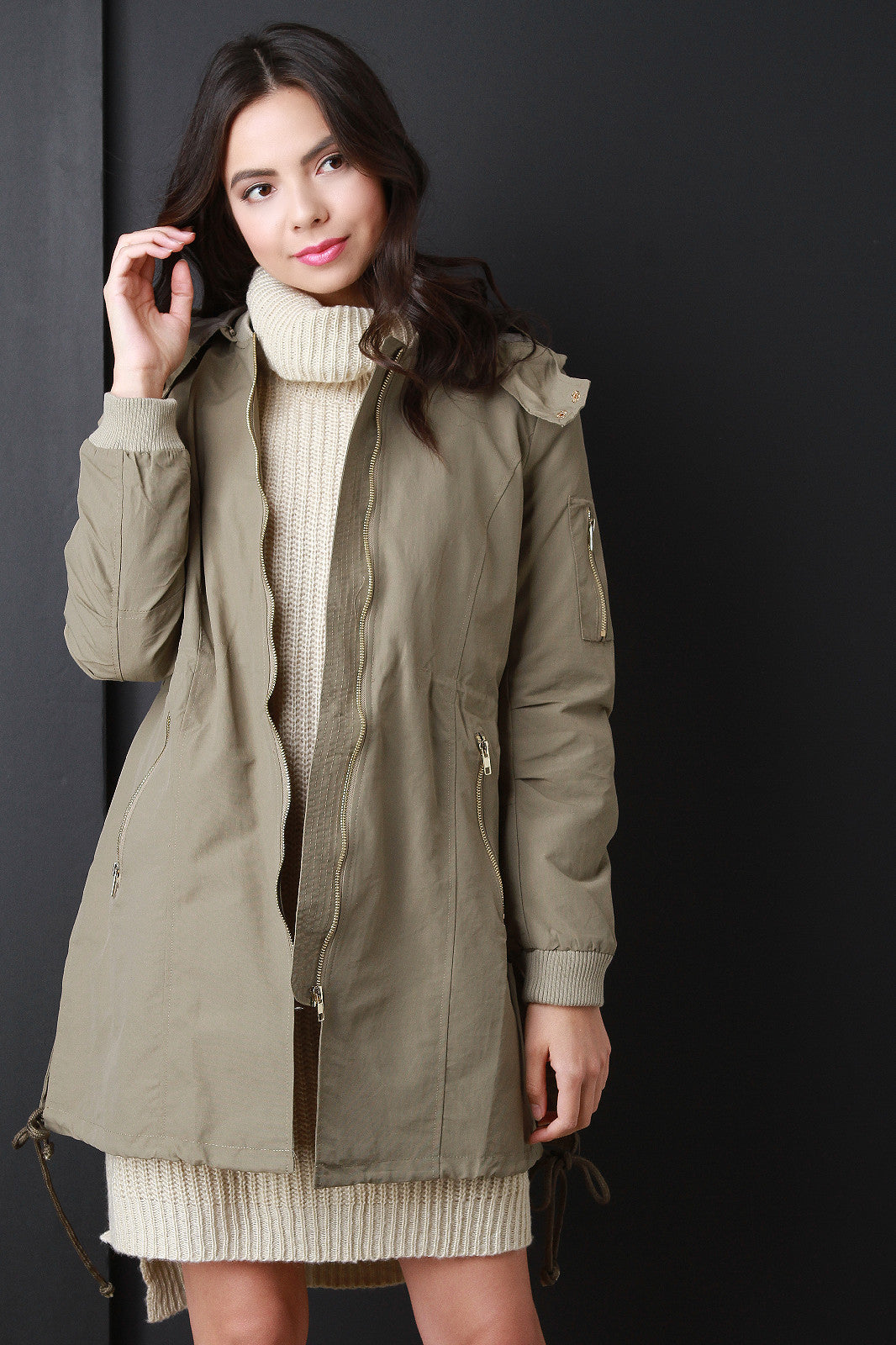 This bomber style trench coat features windbreaker fabric, rib knit trim, zip-up front, removable hood, and self-tie drawstrings. Finished with pockets and lining. Accessories sold separately. Shell: 80% Polyester, 20% Cotton. Lining: 100% Polyester.