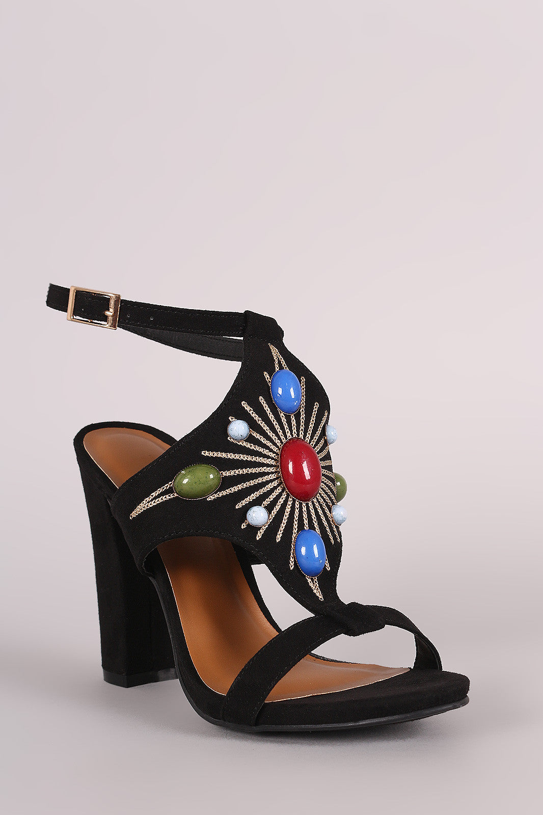This stylish heel features a colorful gemstones embellished shield design, open toe silhouette, and chunky wrapped heel. Adjustable ankle strap with buckle closure. Finished with a lightly padded insole for comfort.