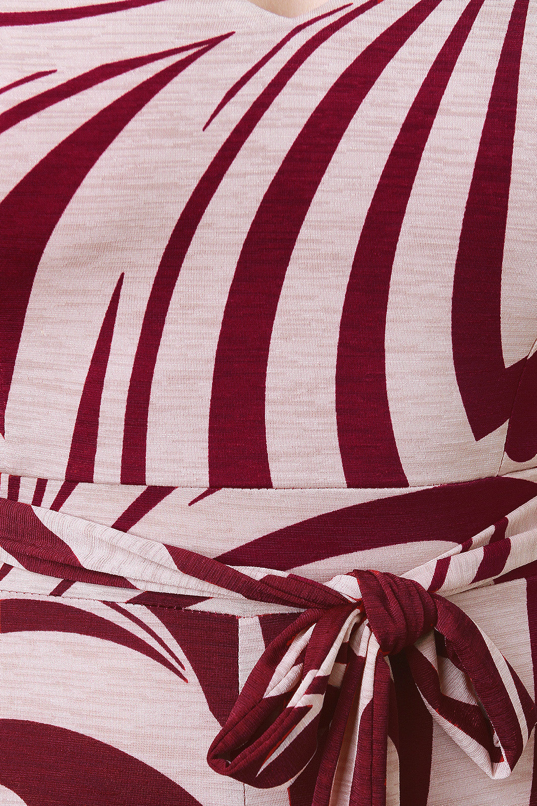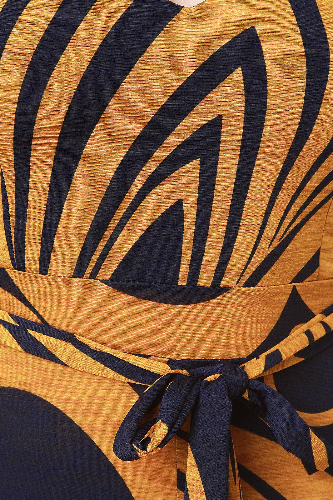 This jumpsuit features a bulgari pattern print on stretchy knit fabrication, cap sleeves, u-neckline, cinched high waisted seam with self-tie sash, and wide cut legs. Accessory sold separately. Made in U.S.A. 95% Polyester, 5% Spandex.