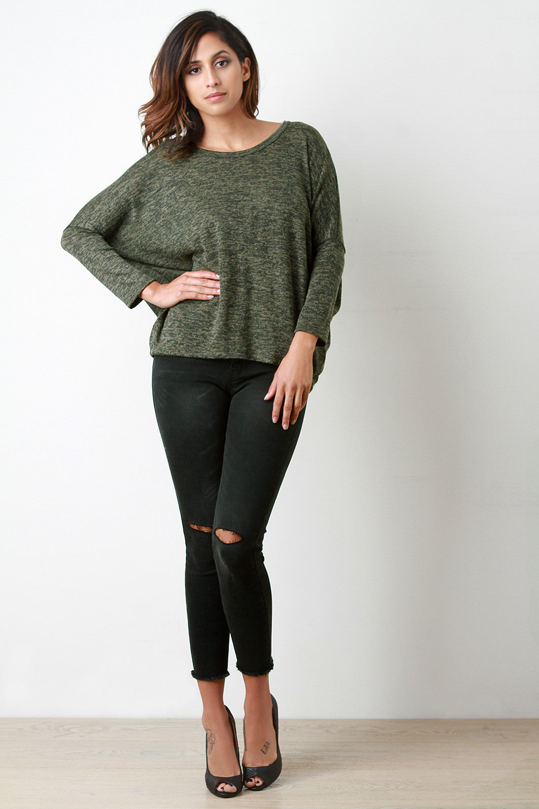 This sweater features a heathered knit fabrication, rounded neckline, dolman style long sleeves, over-sized boxy fit and a faux back button up detail. Accessories sold separately. Made in U.S.A. 96% Polyester, 4% Spandex.
