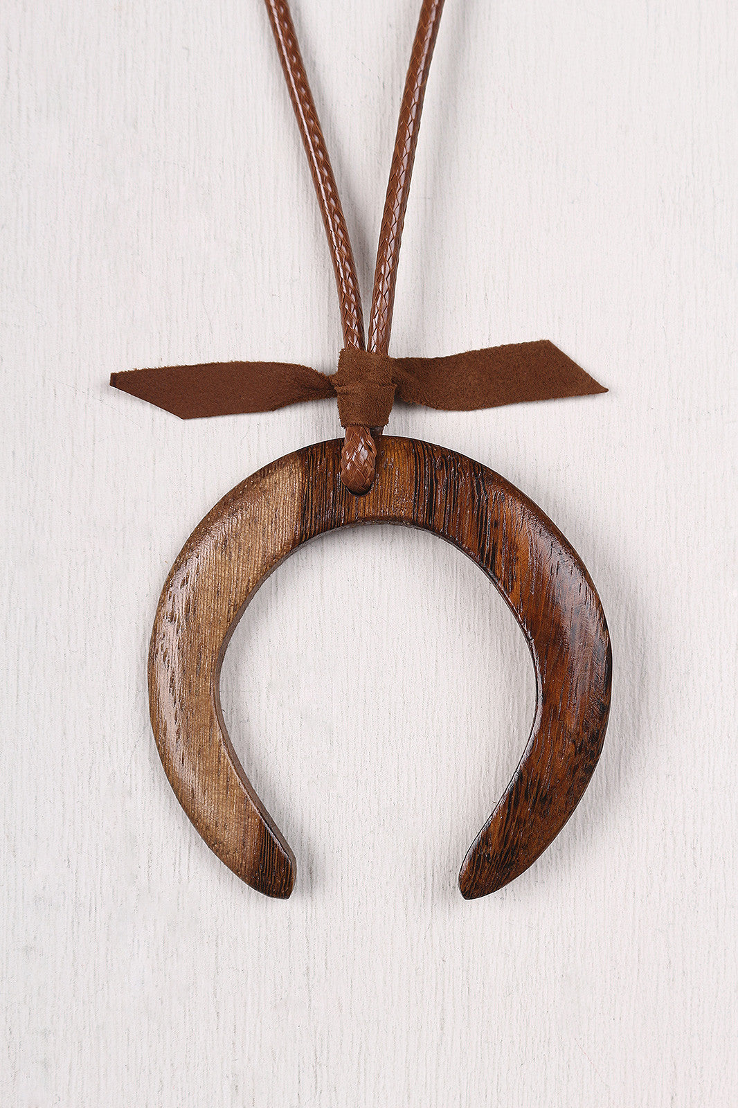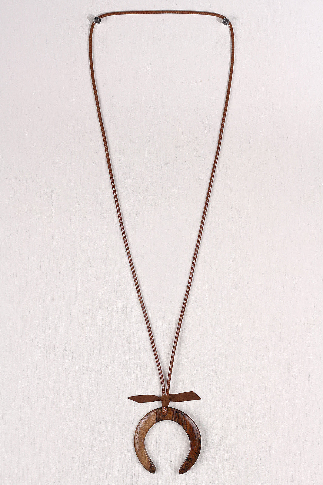 This simple pendant necklace features a woven cord, wood pendant and vegan leather bow. No closures for an easy slip over design.