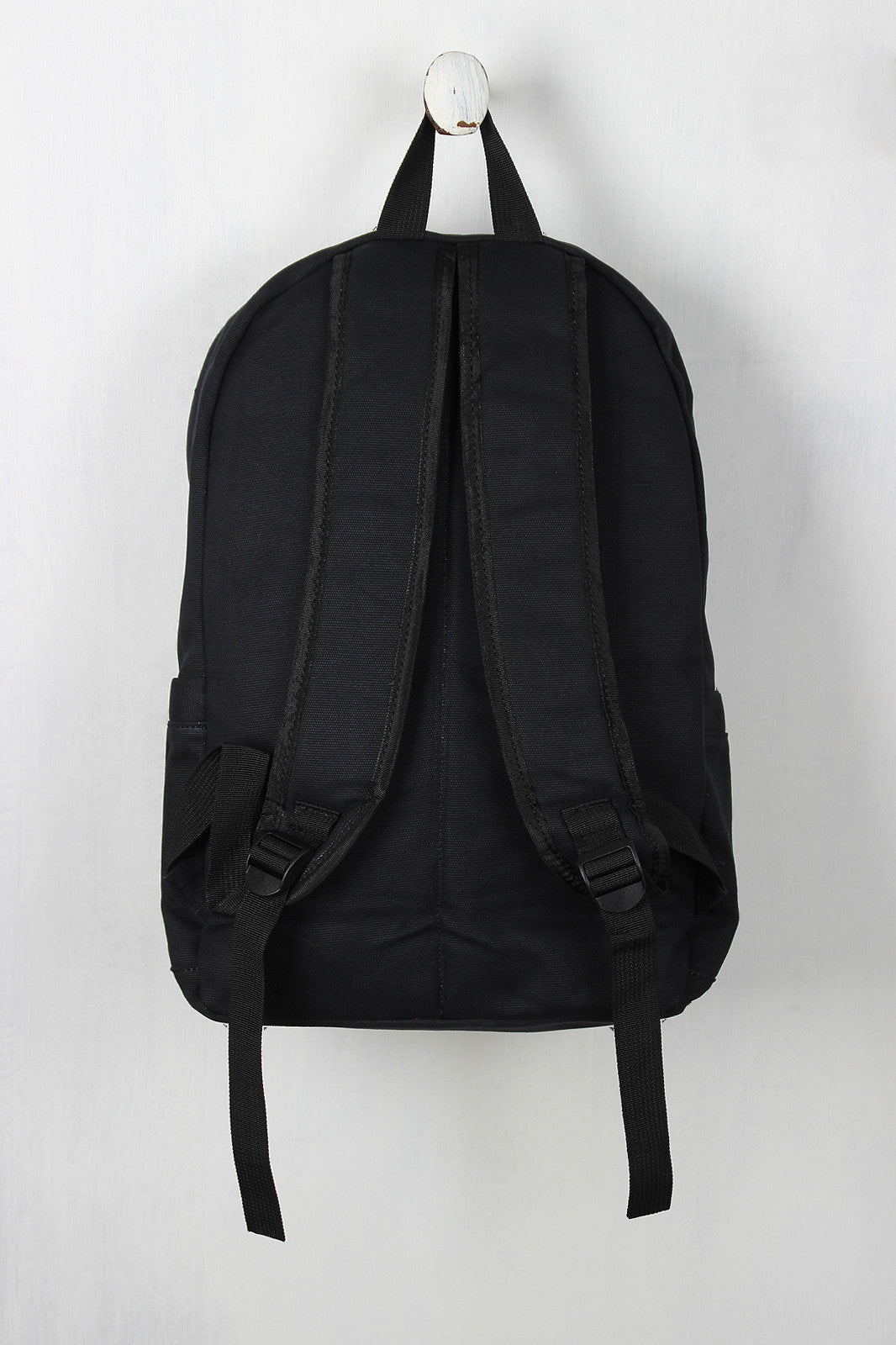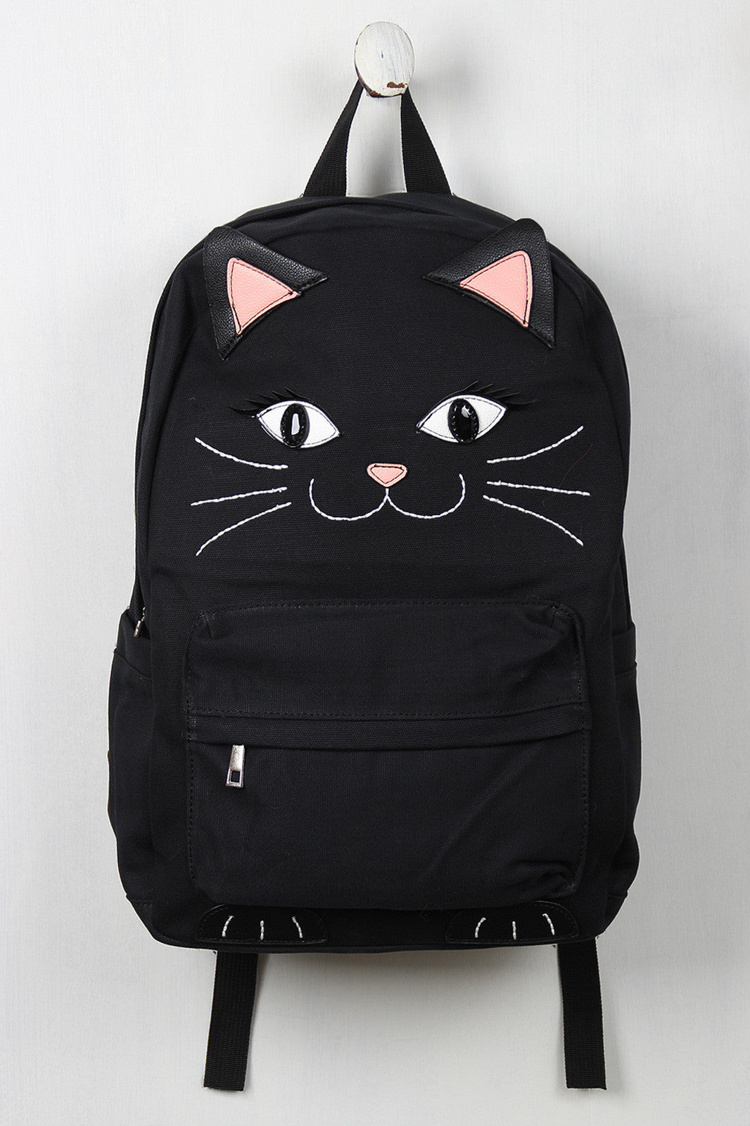 This adorable backpack will have you purring with delight. Featuring a canvas fabrication, kitty face embroidered to the front, with vegan leather applique pieces, front zip pocket, two side slip pockets, and a main zipper pouch, lightly cushioned back and adjustable shoulder straps.