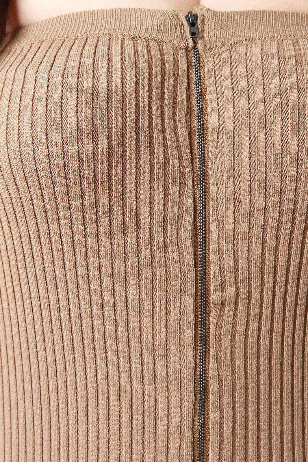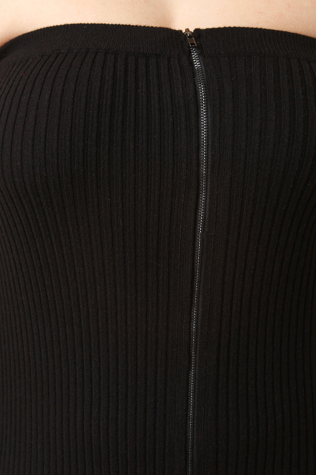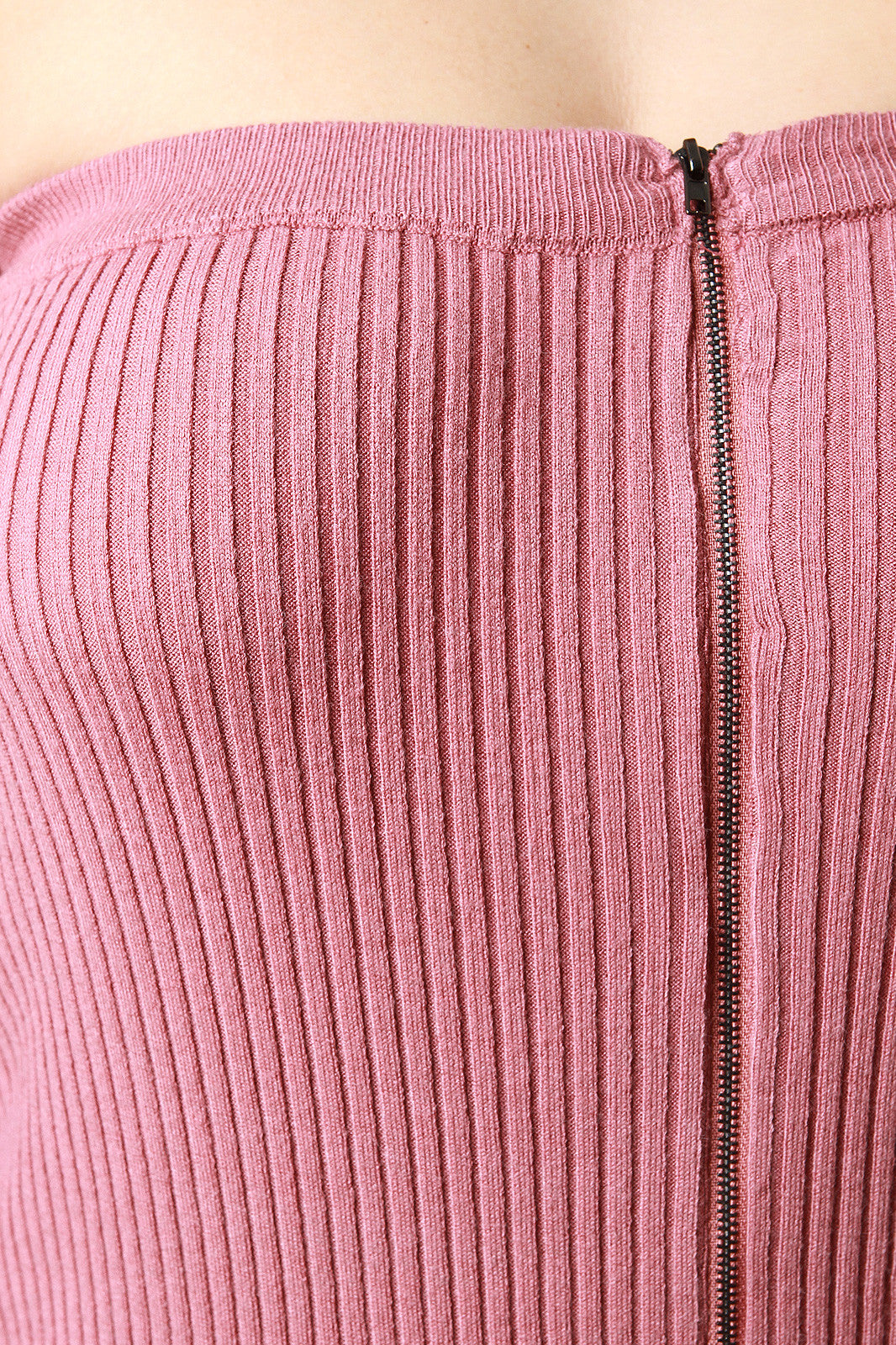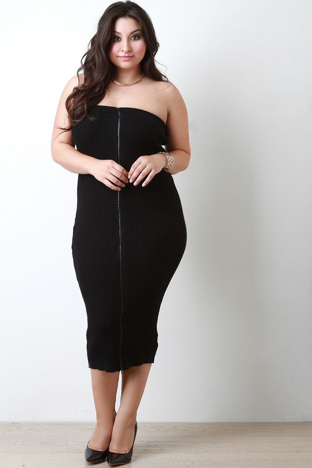 This dress features ribbed knit fabrication, elasticized strapless tube neckline, zipper front, and midi length hemline. Accessory sold separately. 50% Acrylic, 30% Polyester, 20% Wool.