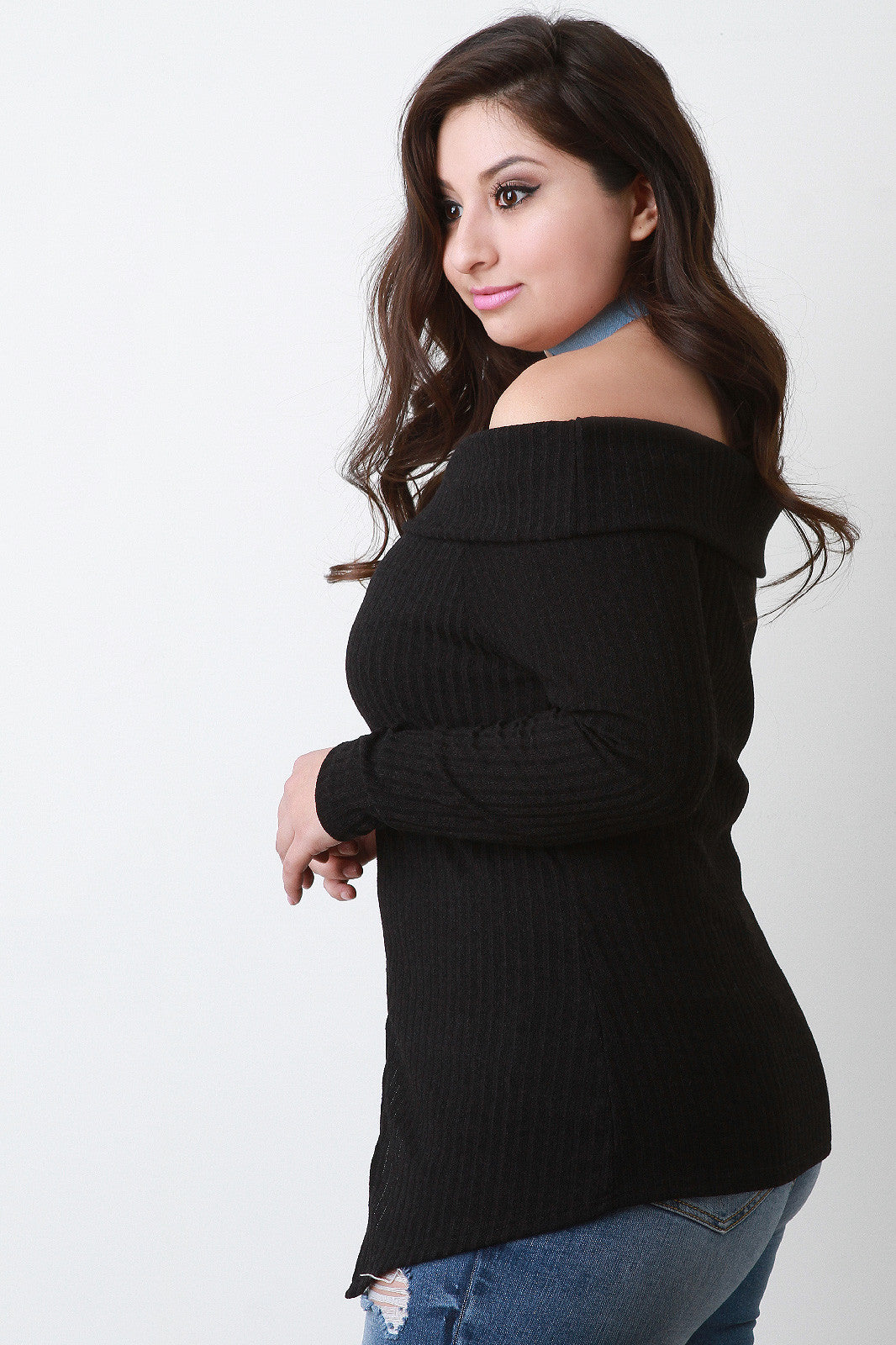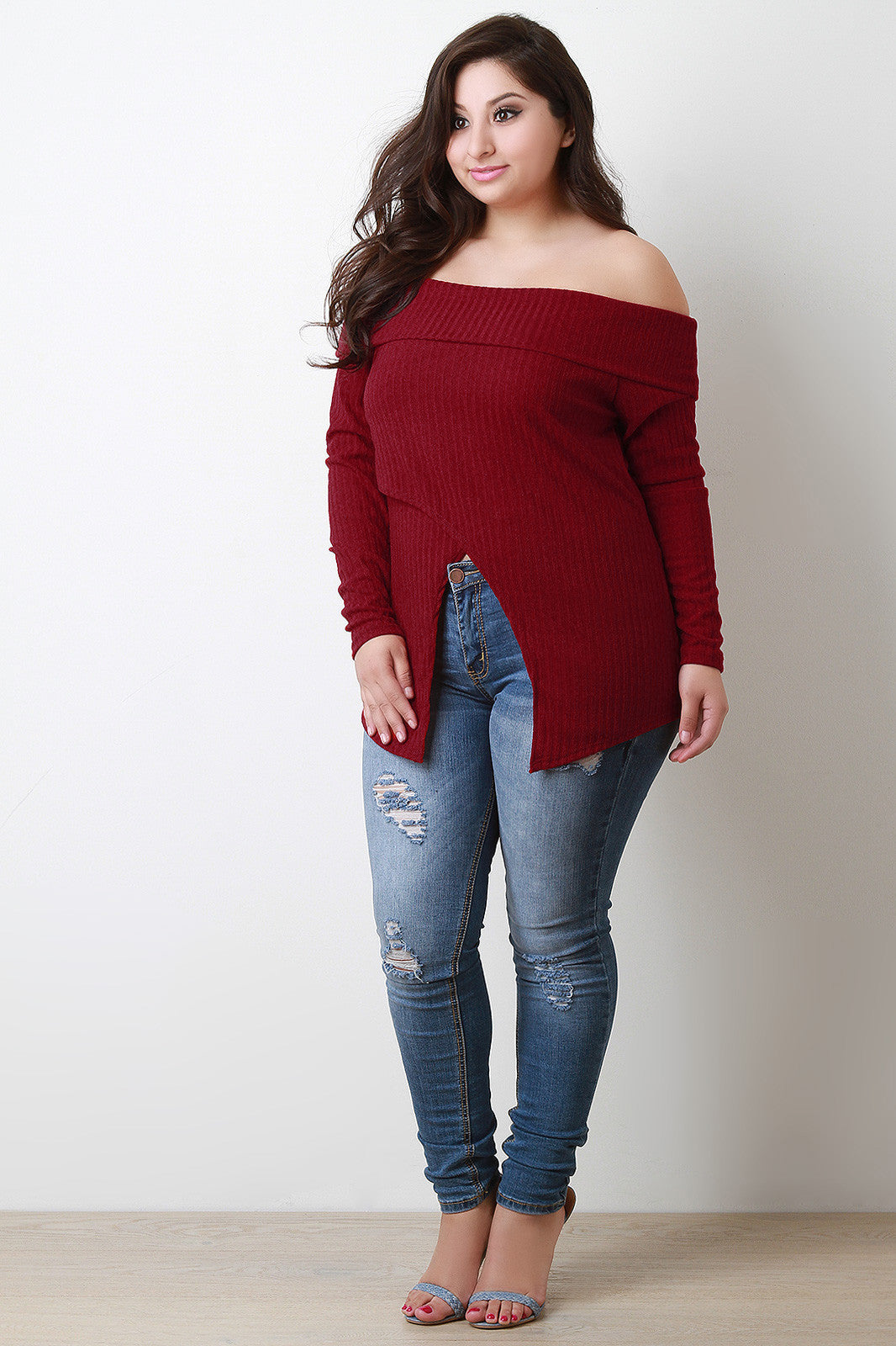 This plus size top features a ribbed knit, banded off-the-shoulder neckline, long sleeves, front wrapped design, and asymmetrical hemline. Accessories sold separately. Made in U.S.A. 92% Polyester, 8% Spandex.