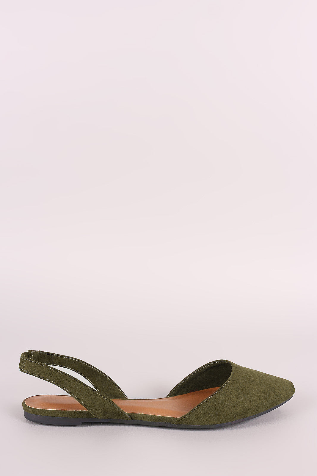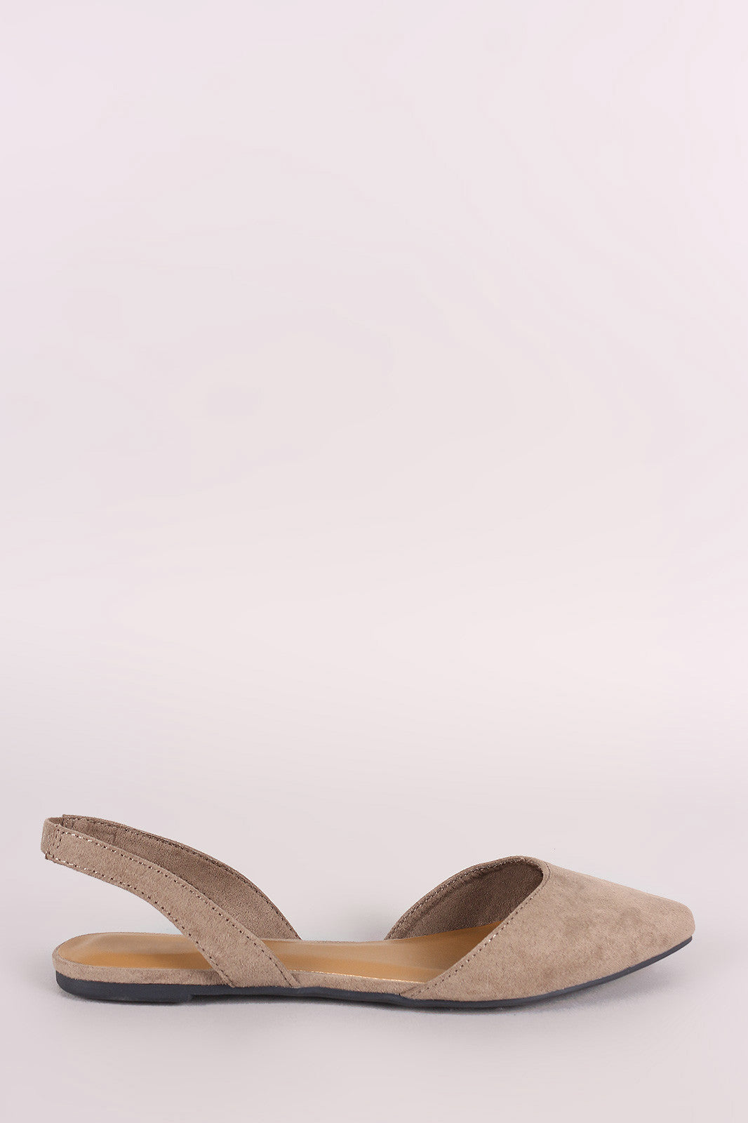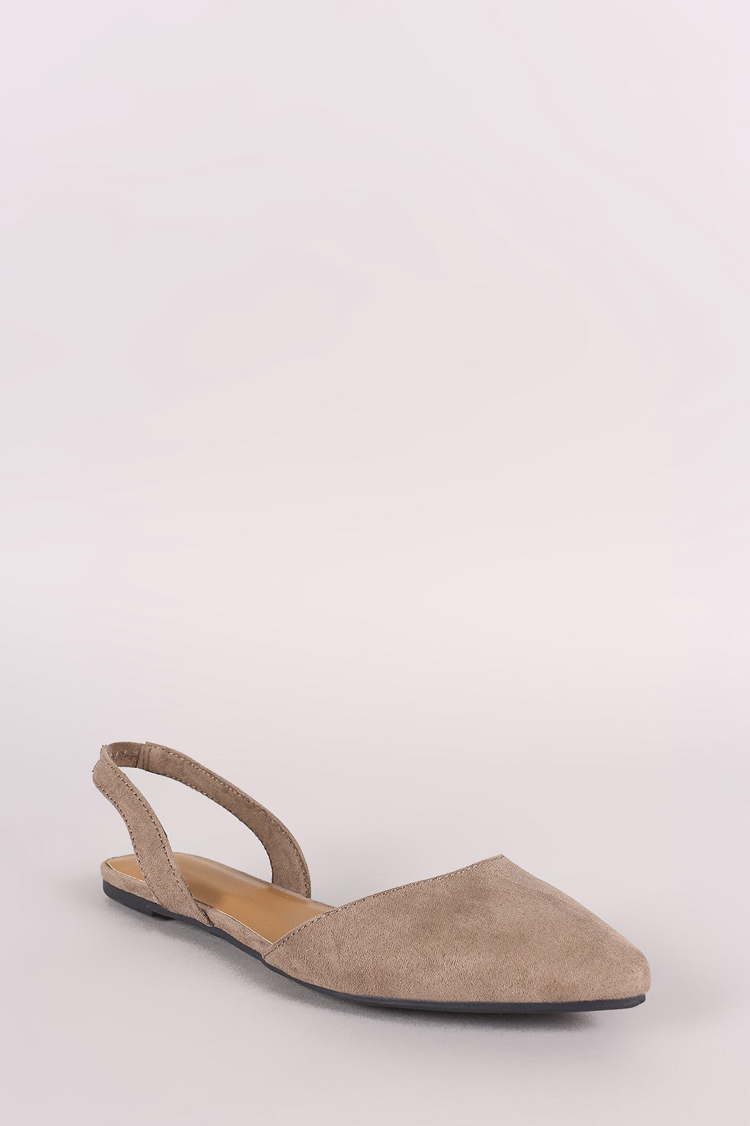 This lightweight flat features a vegan suede upper, pointy toe silhouette, and slingback strap with partial elastic gore insert. Finished with a lightly padded insole for comfort.