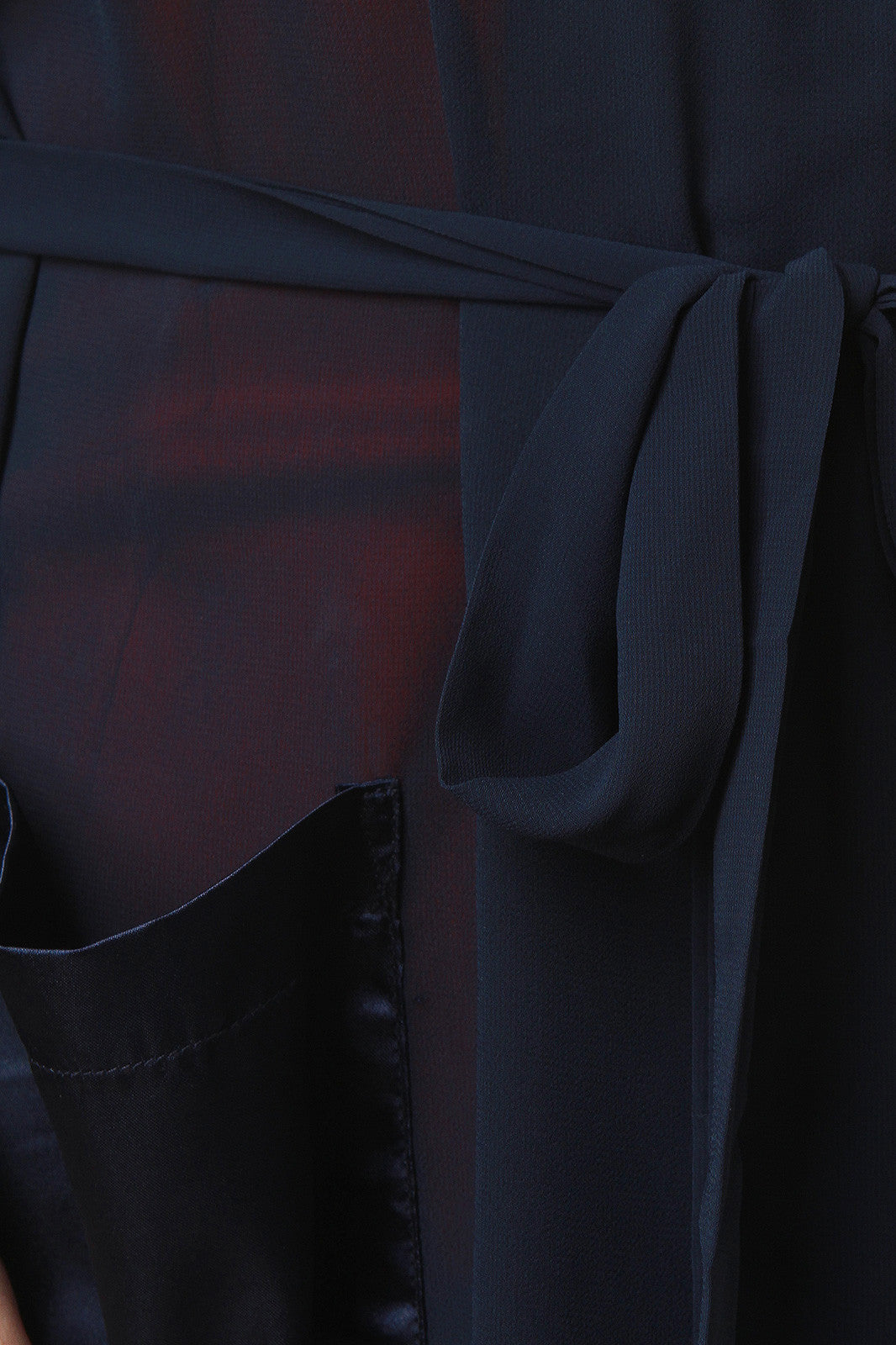 This plus size maxi top features a semi-sheer chiffon fabric, contrast front silk pockets, and self-tie sash on waist and long sleeves. Button-up closure, notched collars, and side slits finish. Accessories sold separately. 100% Polyester.
