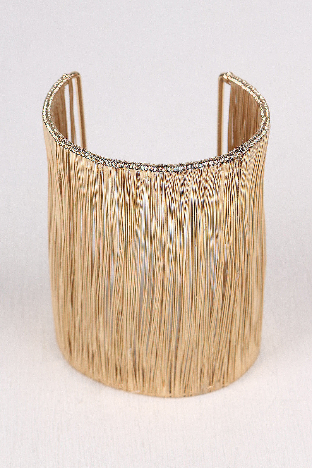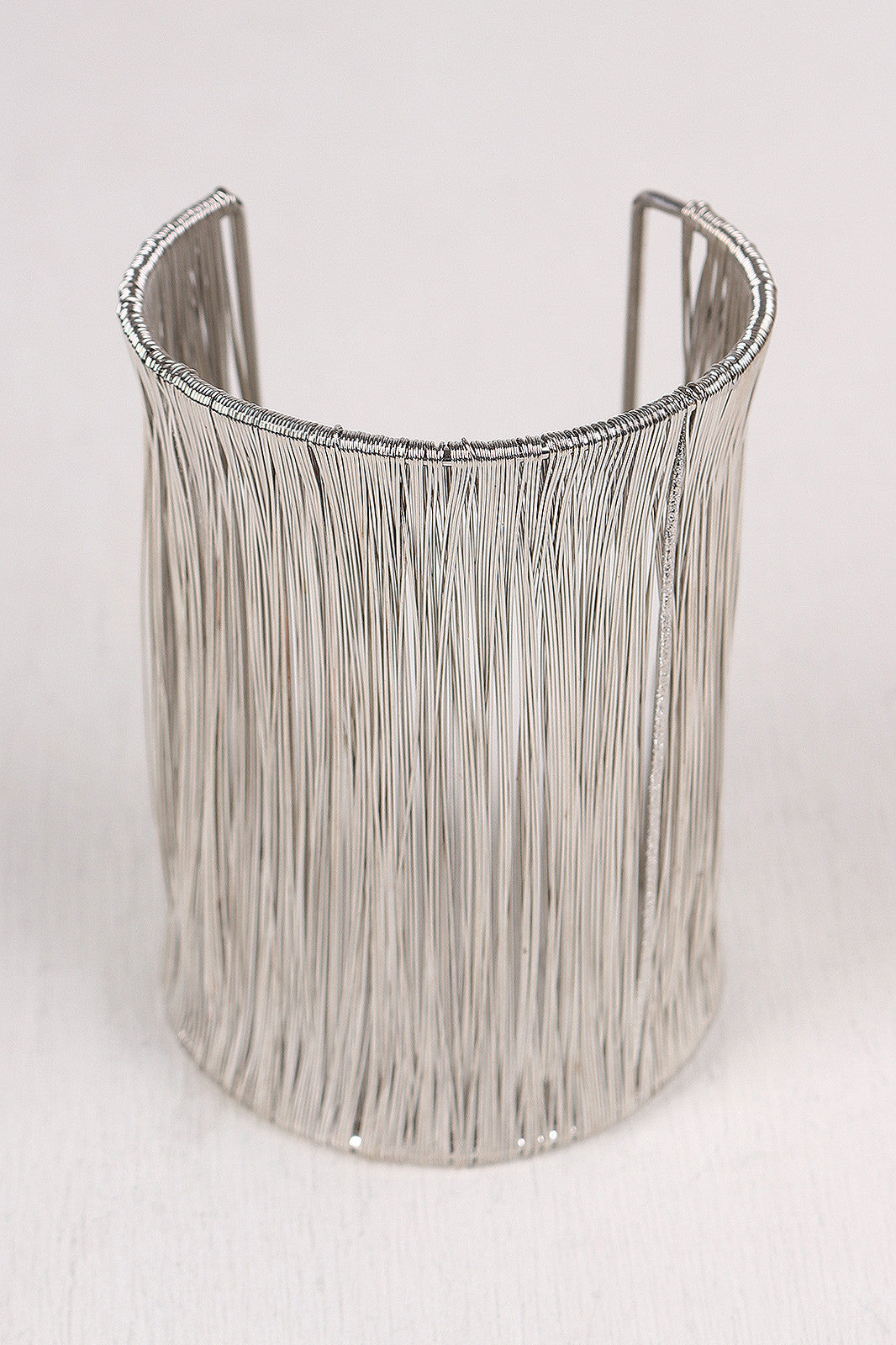 This chic cuff features a wire wrapped style, wide design and open ended for easy on/off.