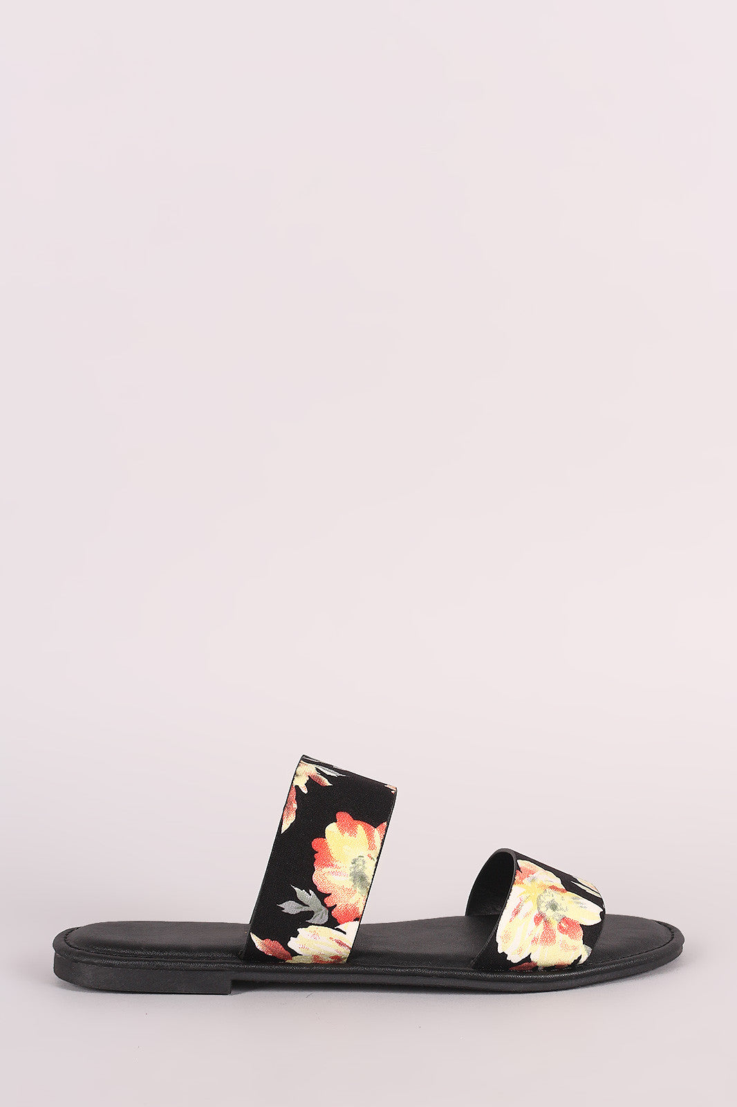 This slide sandal features a colorful watercolor prints fabric, open toe silhouette, and double wide bands across vamp. Lightly padded insole.