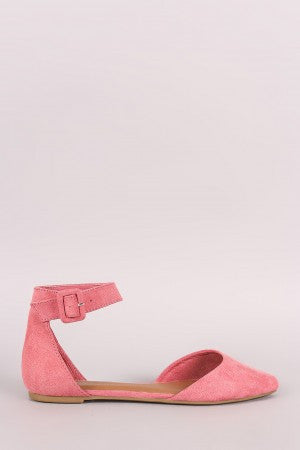 These chic flats feature a vegan suede fabrication, a pointy toe silhouette, open shank, lightly padded insole, and finished with an adjustable ankle strap buckle closure.