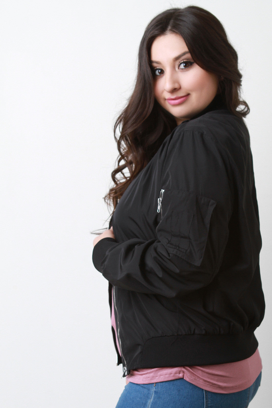 This jacket features a zip up front, long sleeves with zip pocket at left sleeves, side pockets, ribbed knit trim, and fully lined. Accessory sold separately. 100% Polyester.