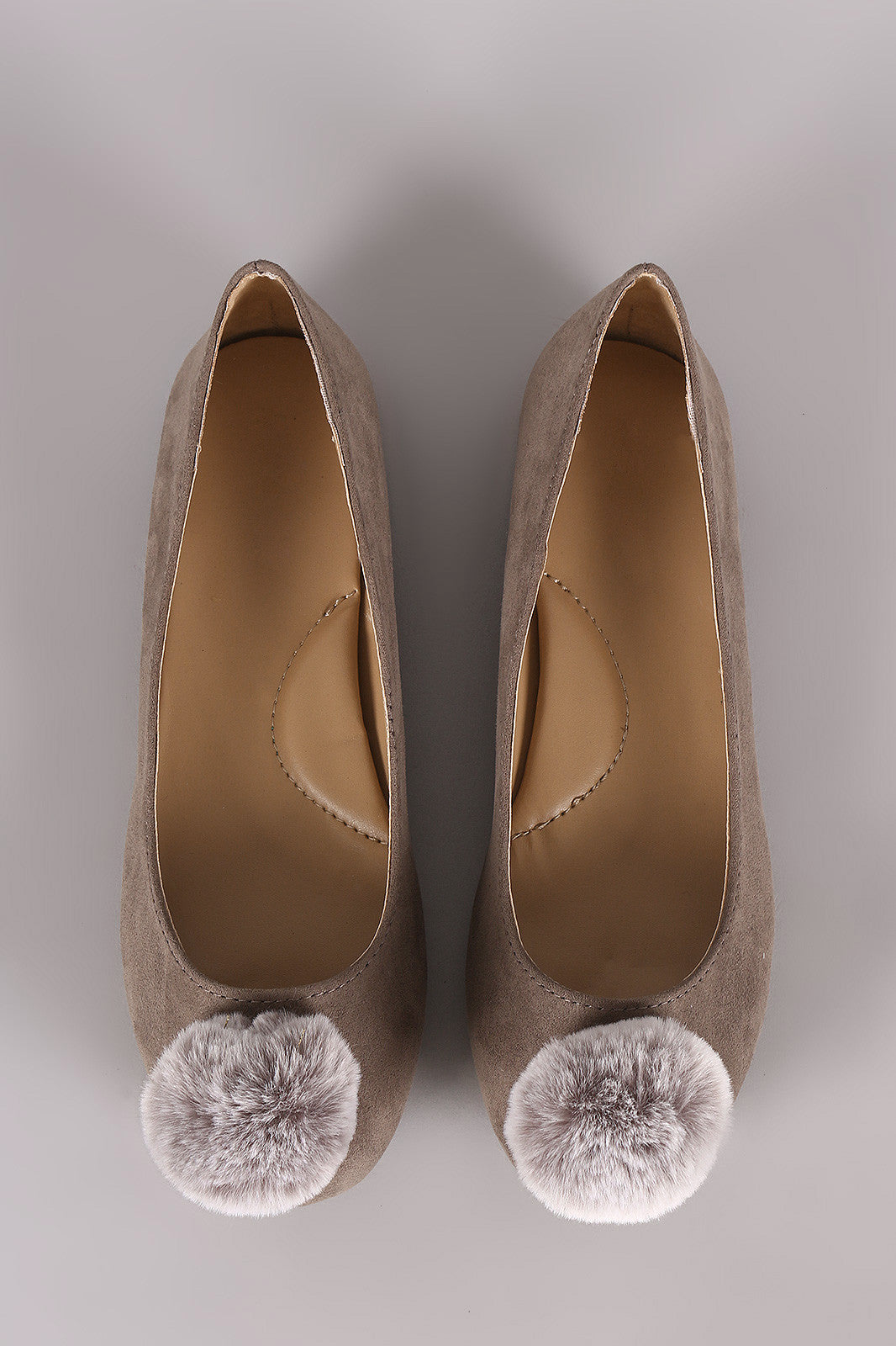This ballet flat features a vegan suede upper, scooped vamp, round toe silhouette with a furry pompom accent. Finished with a lightly padded insole for comfort.
