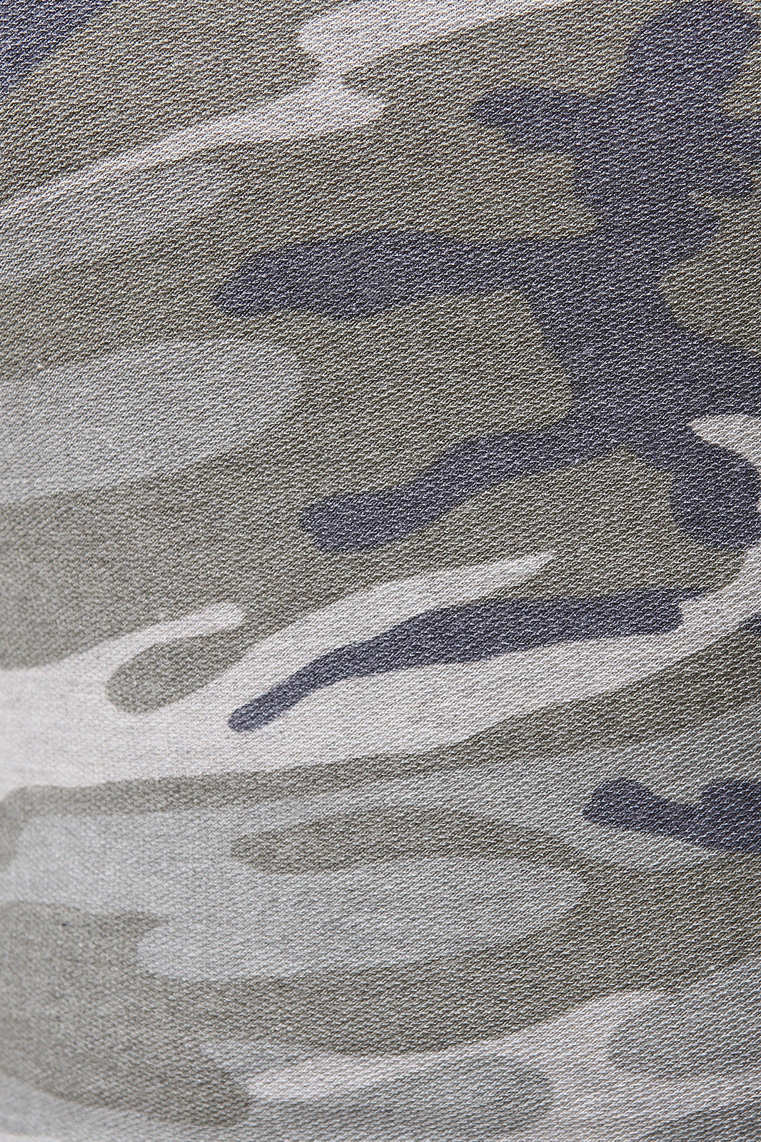 This plus size top features a camouflage print, terry knit fabrication, scooped neckline, short sleeve construction, and a cropped hemline. Accessories sold separately. Made in U.S.A. 86% Polyester, 10% Rayon, 4% Spandex.