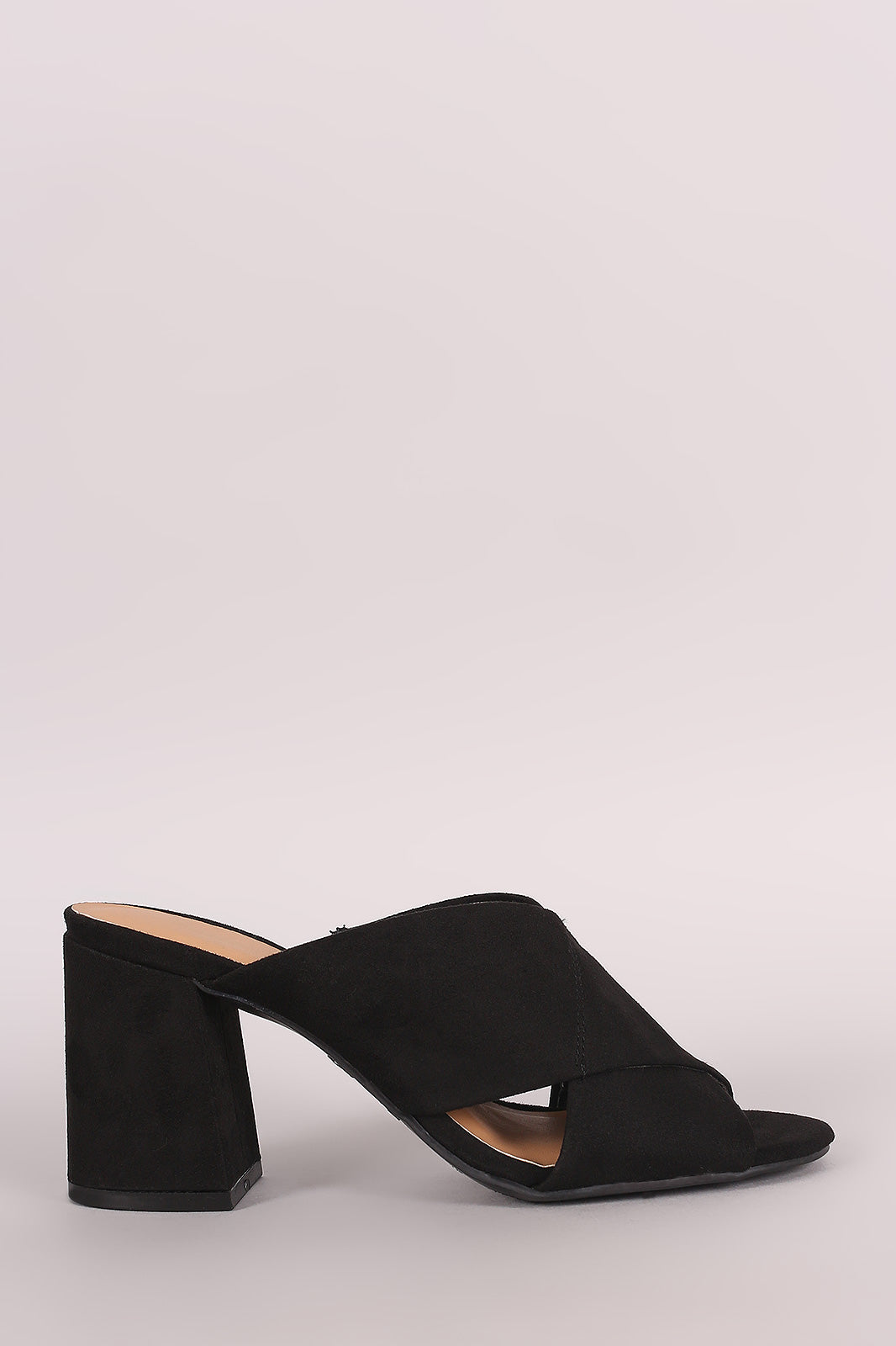 This stylish mule heel features vegan suede fabrication, crisscross bands, open toe silhouette, and chunky covered heel. Finished with a lightly padded insole and easy slide style.