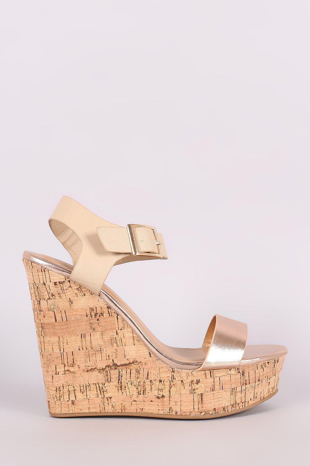 This open toe platform wedge features a metallic band across vamp, a color block design, cork platform and wedge heel, lightly padded insole and finished with a slingback with side buckle fastening.