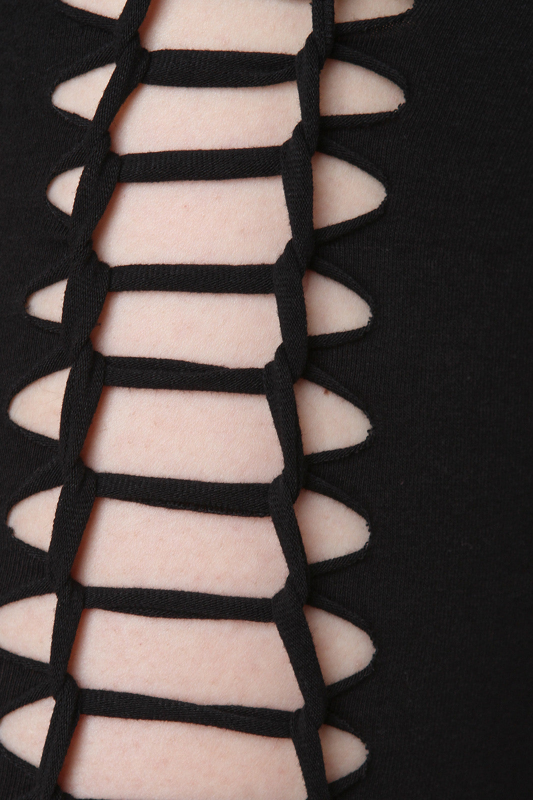These sexy jersey knit leggings feature an elasticized waistband, high waisted, stretchy sculpture fit, taper cut legs and a braided cutout constructed front. Accessories sold separately. Made in U.S.A. 94% Cotton, 6% Spandex.