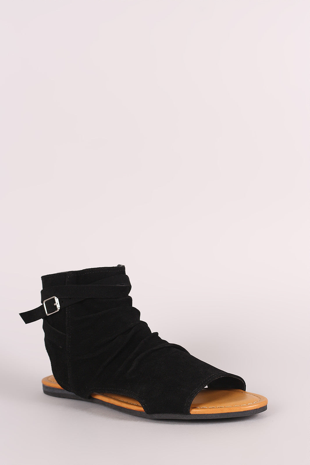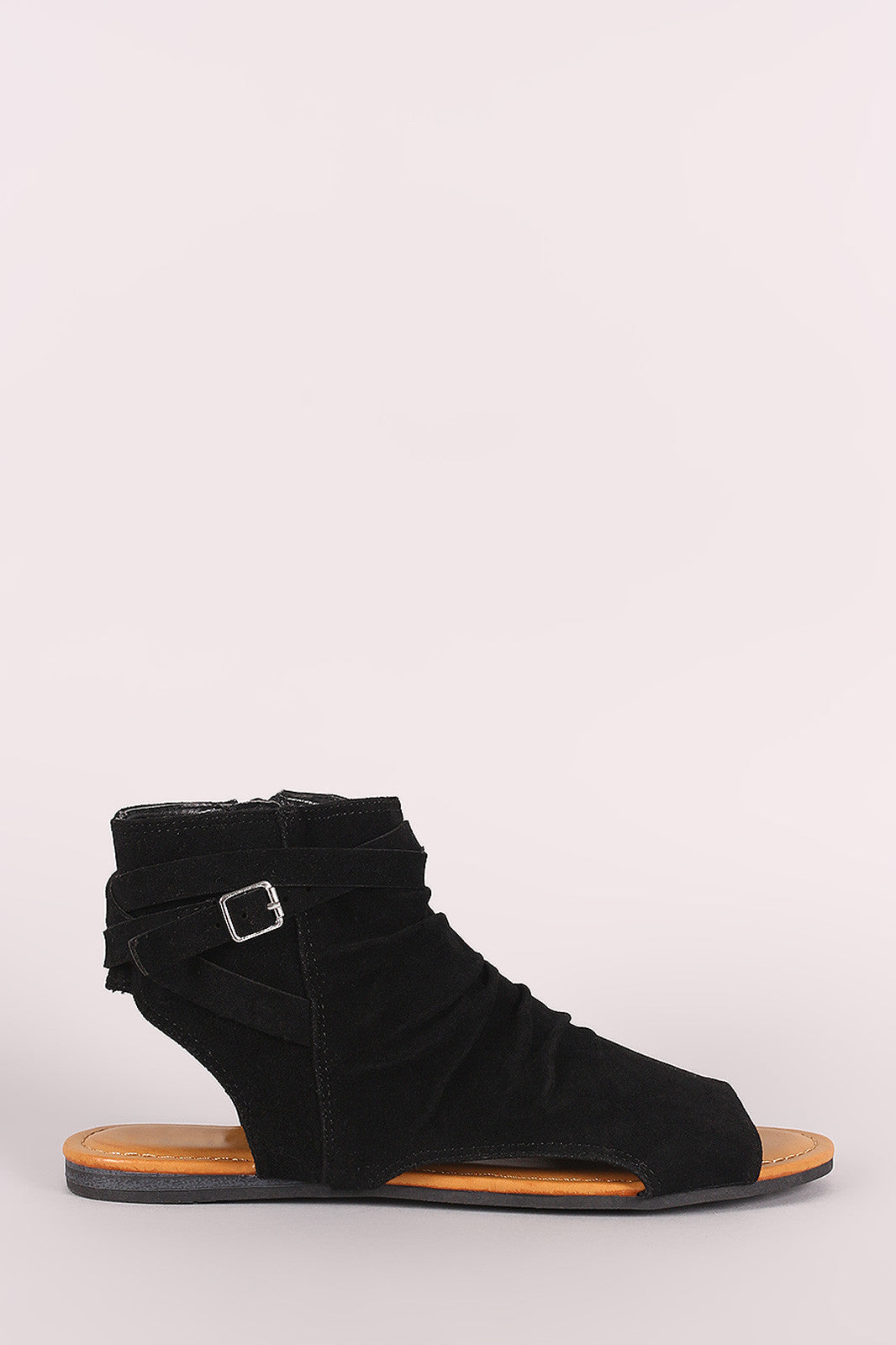 These edgy flat sandals feature an open toe silhouette, slouchy shaft with wrapped around buckle strap detail, side cutout design, and slight stacked heel. Finished with a side zipper closure and lightly padded insole.