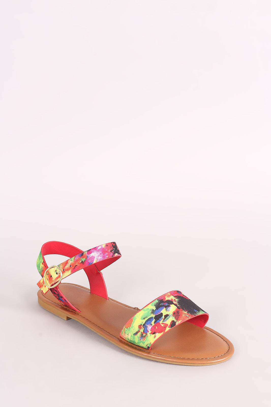 This flat sandal features a watercolor print fabric, one band across vamp, lightly padded insole, and adjustable ankle strap with side buckle closure.