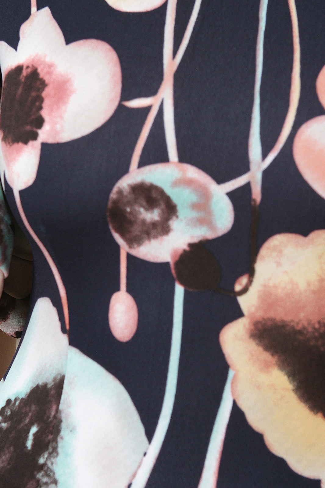 This bodycon dress features floral print, mock neckline, short bell sleeves, and hidden zipper back. Accessories sold separately. Made in U.S.A. 95% Polyester, 5% Spandex.
