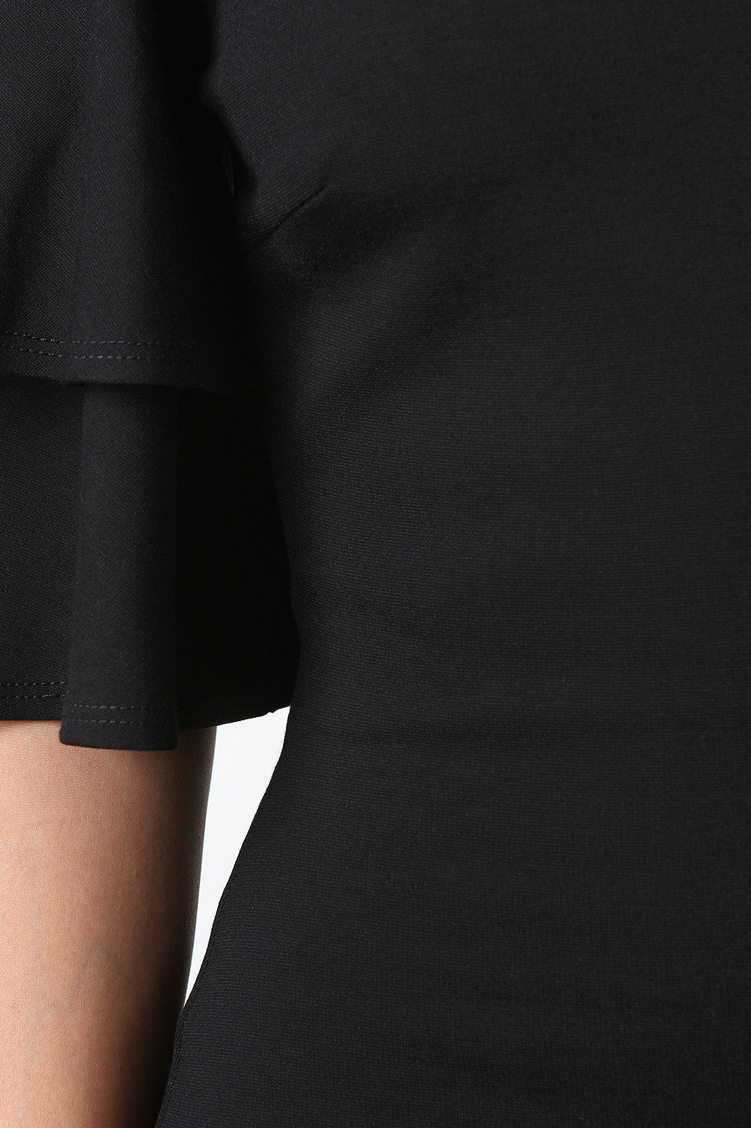 This bodycon dress features a stretchy knit, off the shoulder neckline, short bell ruffle tiered sleeves and a midi length hemline. Accessories sold separately. Made in U.S.A. 62% Viscose, 33% Nylon, 5% Spandex.