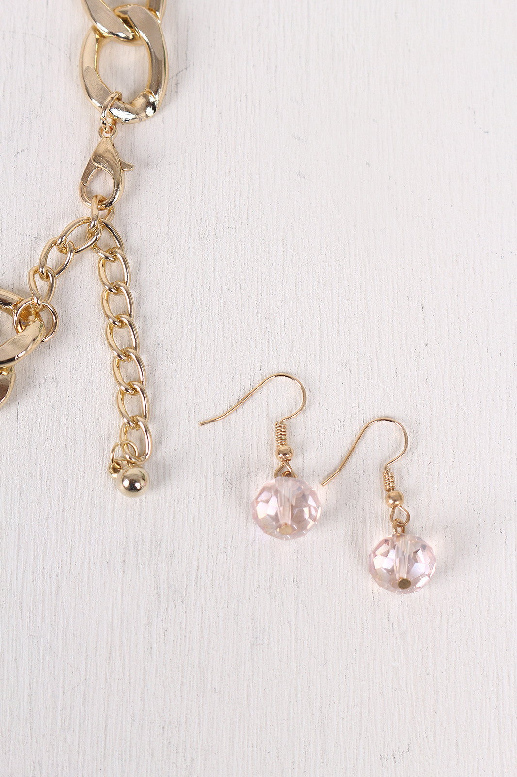 This bib necklace features multi color flowers with colorful beads accents, large curb-link chains, adjustable lobster hook closure, and matching earrings.
